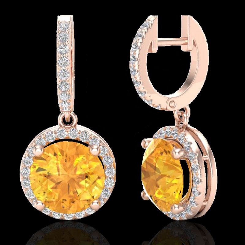 REF-72X8T -23179 ---- 4 CTW Citrine & Micro Pave VS/SI Diamond Designer Halo 14K Rose Gold ---- Luxury Designer Brand Earring Appraised at $4,800 Certificate Number US23179 14k Rose gold, Earring Size is 1 Inches, Earring measuring approx. 1/2" x 1" , weighing in total approx. 5 grams. Made in the USA and is stamped 14k, Main stone 3.5 carat total weight containing 2 pieces of Translucent Yellow color with AAA quality Round shape cut Citrine , Stone #2 0.5 carat total weight containing 68 pieces of H-I color with VS/SI quality Round shape cut Diamond