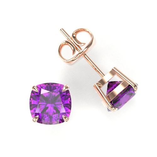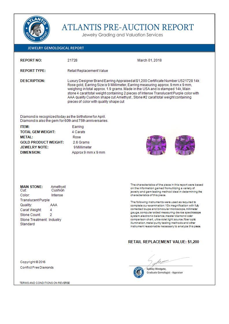 REF-18F2N -21728 ---- 4 CTW Cushion Cut Amethyst Designer Solitaire Stud Earrings 14K Rose Gold ---- Luxury Designer Brand Earring Appraised at $1,200 Certificate Number US21728 14k Rose gold, Earring Size is 9 Millimeter, Earring measuring approx. 9 mm x 9 mm, weighing in total approx. 1.9 grams. Made in the USA and is stamped 14k, Main stone 4 carat total weight containing 2 pieces of Intense Translucent Purple color with AAA quality Cushion shape cut Amethyst , Stone #2 carat total weight containing pieces of color with quality shape cut