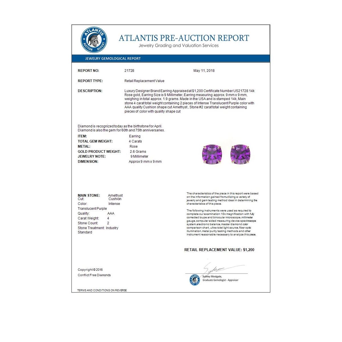 REF-18F2N -21728 ---- 4 CTW Cushion Cut Amethyst Designer Solitaire Stud Earrings 14K Rose Gold ---- Luxury Designer Brand Earring Appraised at $1,200 Certificate Number US21728 14k Rose gold, Earring Size is 9 Millimeter, Earring measuring approx. 9 mm x 9 mm, weighing in total approx. 1.9 grams. Made in the USA and is stamped 14k, Main stone 4 carat total weight containing 2 pieces of Intense Translucent Purple color with AAA quality Cushion shape cut Amethyst , Stone #2 carat total weight containing pieces of color with quality shape cut