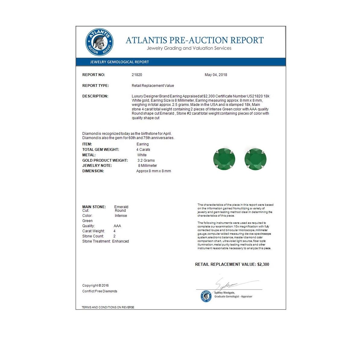REF-34T5M -21820 ---- 4 CTW Emerald Designer Inspired Solitaire Stud Earrings 18K White Gold ---- Luxury Designer Brand Earring Appraised at $2,300 Certificate Number US21820 18k White gold, Earring Size is 8 Millimeter, Earring measuring approx. 8 mm x 8 mm, weighing in total approx. 2.5 grams. Made in the USA and is stamped 18k, Main stone 4 carat total weight containing 2 pieces of Intense Green color with AAA quality Round shape cut Emerald , Stone #2 carat total weight containing pieces of color with quality shape cut