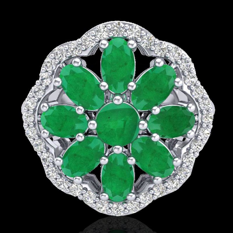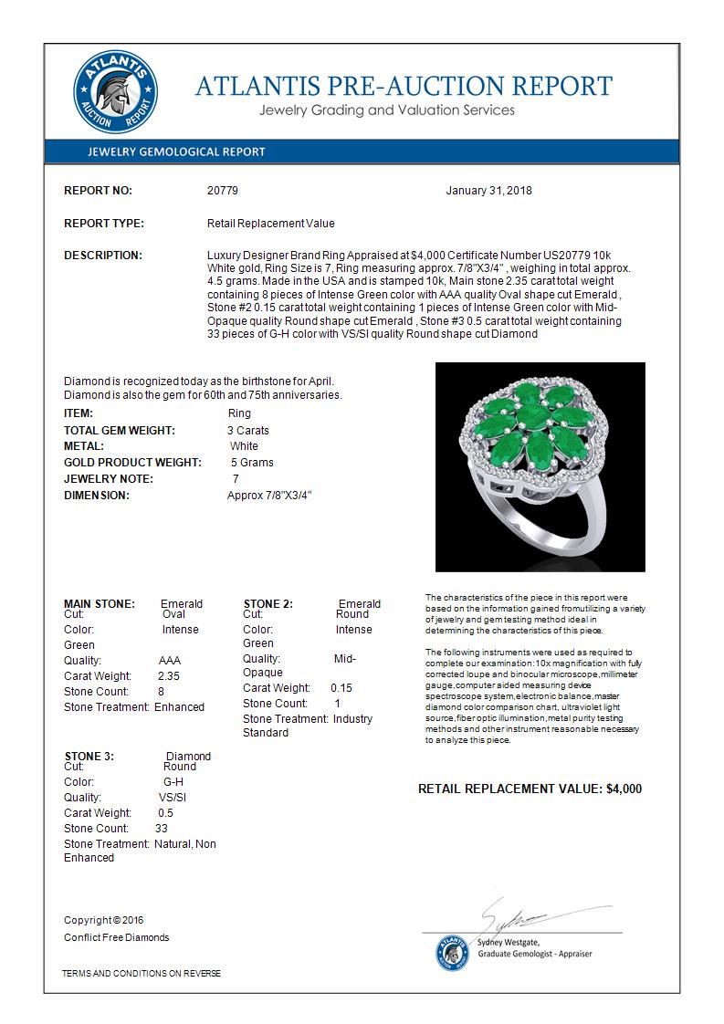 REF-60H9A -20779 ---- 4 CTW Emerald & VS/SI Diamond Cluster Designer Halo Ring 10K White Gold ---- Luxury Designer Brand Ring Appraised at $4,000 Certificate Number US20779 10k White gold, Ring Size is 7, Ring measuring approx. 7/8"X3/4" , weighing in total approx. 4.5 grams. Made in the USA and is stamped 10k, Main stone 2.35 carat total weight containing 8 pieces of Intense Green color with AAA quality Oval shape cut Emerald , Stone #2 0.15 carat total weight containing 1 pieces of Intense Green color with Mid-Opaque quality Round shape cut Emerald , Stone #3 0.5 carat total weight containing 33 pieces of G-H color with VS/SI quality Round shape cut Diamond