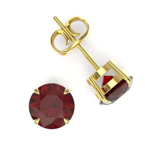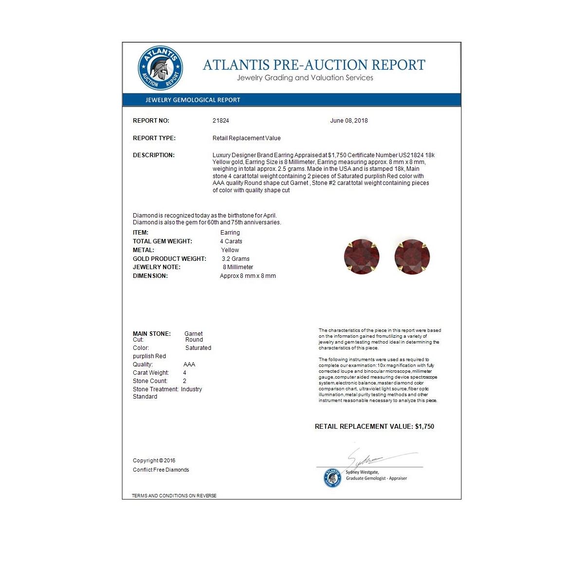 REF-29Y3K -21824 ---- 4 CTW Garnet Designer Inspired Solitaire Stud Earrings 18K Yellow Gold ---- Luxury Designer Brand Earring Appraised at $1,750 Certificate Number US21824 18k Yellow gold, Earring Size is 8 Millimeter, Earring measuring approx. 8 mm x 8 mm, weighing in total approx. 2.5 grams. Made in the USA and is stamped 18k, Main stone 4 carat total weight containing 2 pieces of Saturated purplish Red color with AAA quality Round shape cut Garnet , Stone #2 carat total weight containing pieces of color with quality shape cut