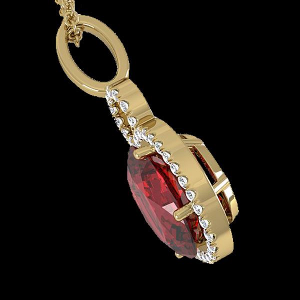 REF-45W3F -22763 ---- 4 CTW Garnet & Micro Pave Solitaire Halo VS/SI Diamond Necklace 14K Yellow Gold ---- Luxury Designer Brand Necklace Appraised at $2,750 Certificate Number US22763 14k Yellow gold, Necklace Size is 16 Inches, Necklace measuring approx. 3/4" x 1/2" , weighing in total approx. 3.4 grams. Made in the USA and is stamped 14k, Main stone 3.72 carat total weight containing 1 pieces of Saturated purplish Red color with AAA quality Oval shape cut Garnet , Stone #2 0.28 carat total weight containing 35 pieces of H-I color with VS/SI quality Round shape cut Diamond