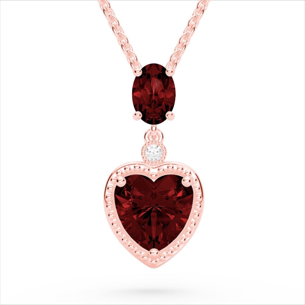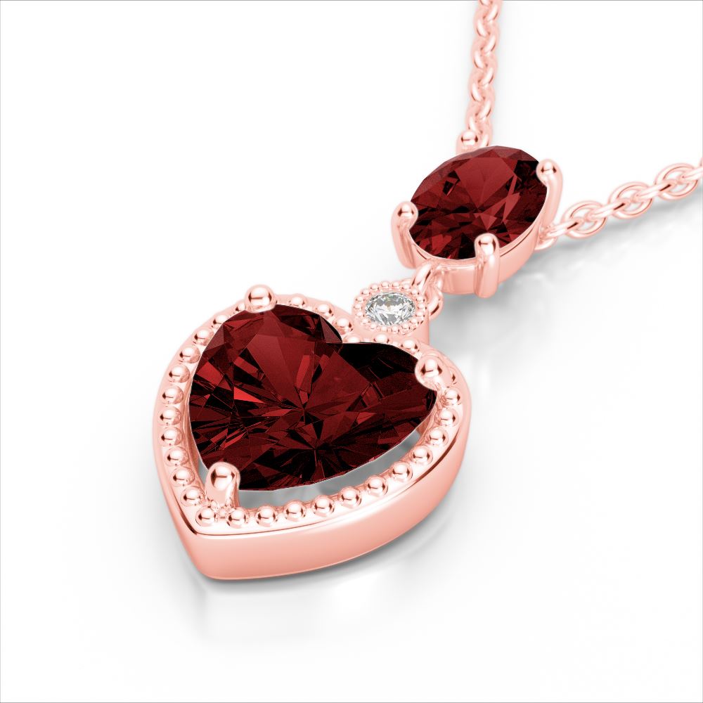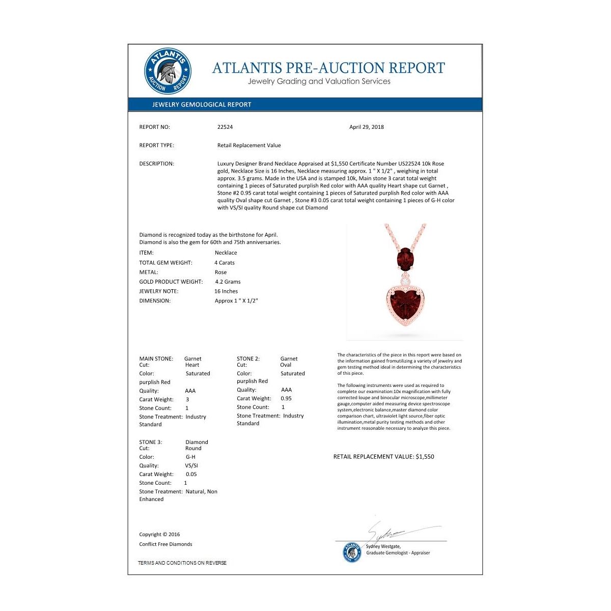 REF-26Y2K -22524 ---- 4 CTW Garnet & VS/SI Diamond Designer Heart Necklace 10K Rose Gold ---- Luxury Designer Brand Necklace Appraised at $1,550 Certificate Number US22524 10k Rose gold, Necklace Size is 16 Inches, Necklace measuring approx. 1 " X 1/2" , weighing in total approx. 3.5 grams. Made in the USA and is stamped 10k, Main stone 3 carat total weight containing 1 pieces of Saturated purplish Red color with AAA quality Heart shape cut Garnet , Stone #2 0.95 carat total weight containing 1 pieces of Saturated purplish Red color with AAA quality Oval shape cut Garnet , Stone #3 0.05 carat total weight containing 1 pieces of G-H color with VS/SI quality Round shape cut Diamond