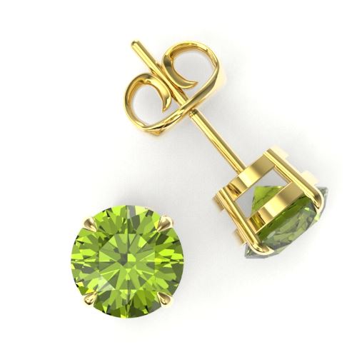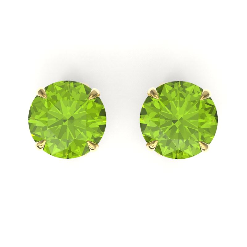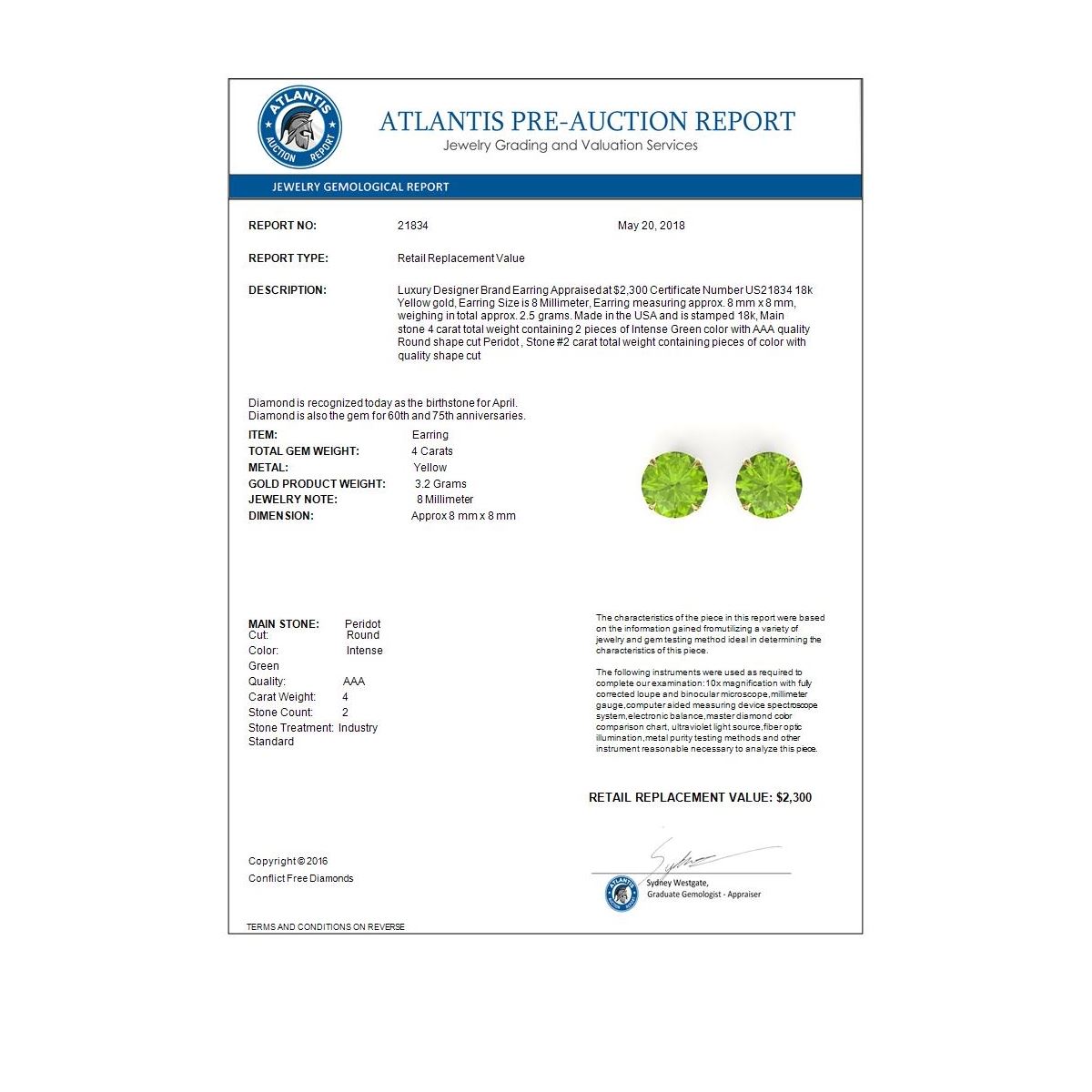 REF-32X2T -21834 ---- 4 CTW Peridot Designer Inspired Solitaire Stud Earrings 18K Yellow Gold ---- Luxury Designer Brand Earring Appraised at $2,300 Certificate Number US21834 18k Yellow gold, Earring Size is 8 Millimeter, Earring measuring approx. 8 mm x 8 mm, weighing in total approx. 2.5 grams. Made in the USA and is stamped 18k, Main stone 4 carat total weight containing 2 pieces of Intense Green color with AAA quality Round shape cut Peridot , Stone #2 carat total weight containing pieces of color with quality shape cut