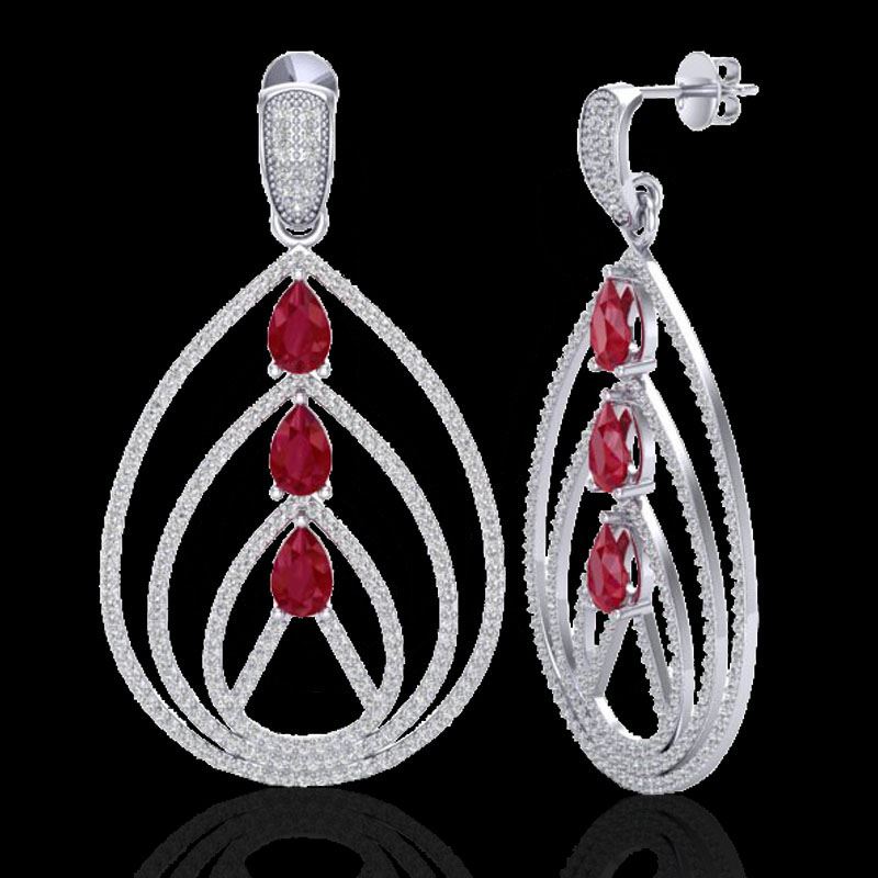 REF-307Y3K -22457 ---- 4 CTW Ruby & Micro Pave VS/SI Diamond Designer Earrings 18K White Gold ---- Luxury Designer Brand Earring Appraised at $23,650 Certificate Number US22457 18k White gold, Earring Size is 1 1/2 Inches, Earring measuring approx. 1 1/2" X 1" , weighing in total approx. 15 grams. Made in the USA and is stamped 18k, Main stone 1.5 carat total weight containing 6 pieces of Mid-Opaque-Deep Red color with AAA quality Pear shape cut Ruby , Stone #2 2.5 carat total weight containing 360 pieces of H-I color with VS/SI quality Round shape cut Diamond