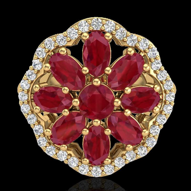 REF-63F8N -20785 ---- 4 CTW Ruby & VS/SI Diamond Cluster Designer Halo Ring 10K Yellow Gold ---- Luxury Designer Brand Ring Appraised at $4,550 Certificate Number US20785 10k Yellow gold, Ring Size is 7, Ring measuring approx. 7/8"X3/4" , weighing in total approx. 4.5 grams. Made in the USA and is stamped 10k, Main stone 2.35 carat total weight containing 8 pieces of Mid-Opaque-Deep Red color with AAA quality Oval shape cut Ruby , Stone #2 0.15 carat total weight containing 1 pieces of Strong Red color with Mid-Opaque quality Round shape cut Ruby , Stone #3 0.5 carat total weight containing 33 pieces of G-H color with VS/SI quality Round shape cut Diamond
