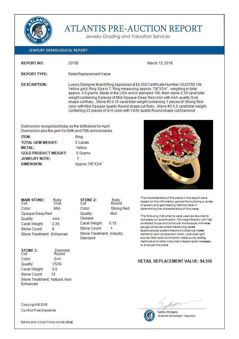 REF-63F8N -20785 ---- 4 CTW Ruby & VS/SI Diamond Cluster Designer Halo Ring 10K Yellow Gold ---- Luxury Designer Brand Ring Appraised at $4,550 Certificate Number US20785 10k Yellow gold, Ring Size is 7, Ring measuring approx. 7/8"X3/4" , weighing in total approx. 4.5 grams. Made in the USA and is stamped 10k, Main stone 2.35 carat total weight containing 8 pieces of Mid-Opaque-Deep Red color with AAA quality Oval shape cut Ruby , Stone #2 0.15 carat total weight containing 1 pieces of Strong Red color with Mid-Opaque quality Round shape cut Ruby , Stone #3 0.5 carat total weight containing 33 pieces of G-H color with VS/SI quality Round shape cut Diamond