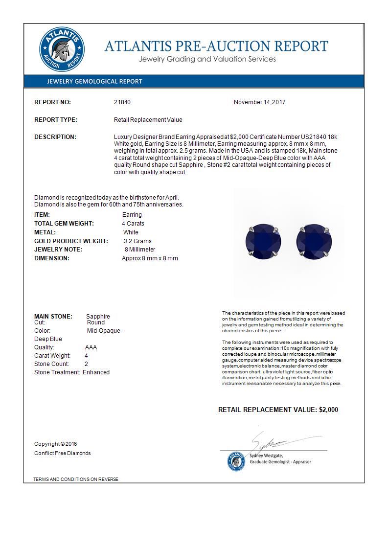 REF-32H9A -21840 ---- 4 CTW Sapphire Designer Inspired Solitaire Stud Earrings 18K White Gold ---- Luxury Designer Brand Earring Appraised at $2,000 Certificate Number US21840 18k White gold, Earring Size is 8 Millimeter, Earring measuring approx. 8 mm x 8 mm, weighing in total approx. 2.5 grams. Made in the USA and is stamped 18k, Main stone 4 carat total weight containing 2 pieces of Mid-Opaque-Deep Blue color with AAA quality Round shape cut Sapphire , Stone #2 carat total weight containing pieces of color with quality shape cut