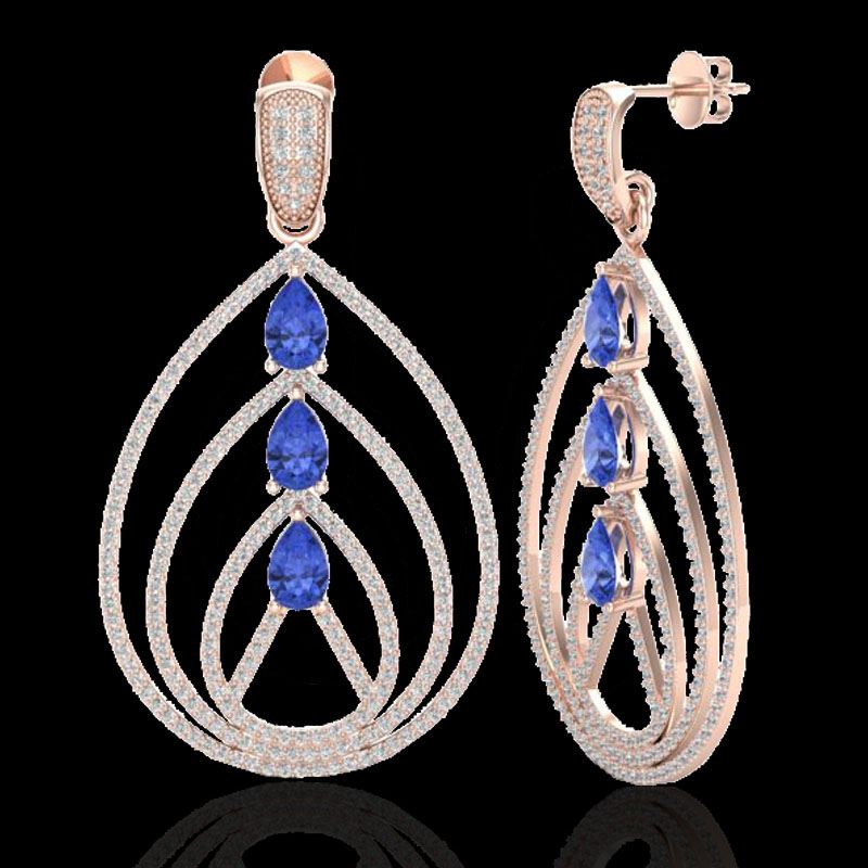 REF-307X3T -22462 ---- 4 CTW Tanzanite & Micro Pave VS/SI Diamond Designer Earrings 14K Rose Gold ---- Luxury Designer Brand Earring Appraised at $23,650 Certificate Number US22462 14k Rose gold, Earring Size is 1 1/2 Inches, Earring measuring approx. 1 1/2" X 1" , weighing in total approx. 15 grams. Made in the USA and is stamped 14k, Main stone 1.5 carat total weight containing 6 pieces of Intense Violet Blue color with AAA quality Pear shape cut Tanzanite , Stone #2 2.5 carat total weight containing 360 pieces of H-I color with VS/SI quality Round shape cut Diamond