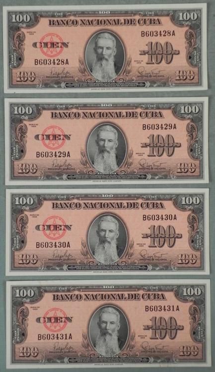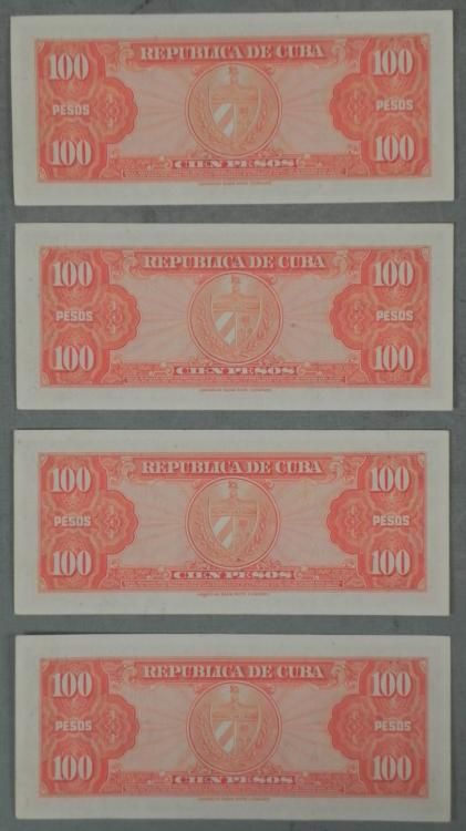 4 Sequentially Numbered Cuban 100 Pesos Bills * * Condition: Crisp Uncirculated