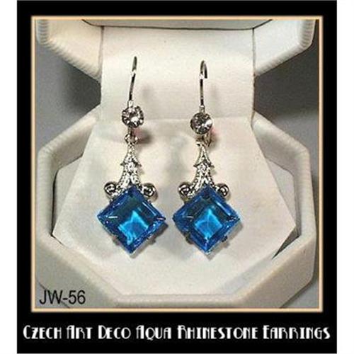 </font></strong>First of all, let me assure you, that although we have multiple listings, these earrings are NOT a "reproduction" or "currently made" or in Art Deco "style". If you want to know bit more history of the earrings, email us. You are bidding on (4) pairs of VINTAGE, pre WW II earrings in MINT unused condition. #54 Red, #56 Aqua Blue, #57 Pink, #54CH Red/Green - your choice of 4 pairs, mix or match. Earrings are set with 10 mm stone and 1 rhinestone in silvertone metal. Spring loaded lever back closure for pierced ears. Beautiful workmanship from the Art Deco era, Czechoslovakia circa 1930's. It is very difficult to capture the beauty which eye so easily perceives. Dimension : 1-5/8"L x 1/2"W. These earrings are available individually at $35 per pair - green color earrings not pictured but shown as part of "Christmas" version, is also available. . Red/Green (Christmas) earrings - One customer asked us if we would sell her a pair of earrings, 1 with green and 1 with red stone. She said this would be very chic, unusual and perfect to wear for Christmas Holidays. Since we have multiples of each color, we agreed..... Now we are offering this "CHIC" combination to you. </font>