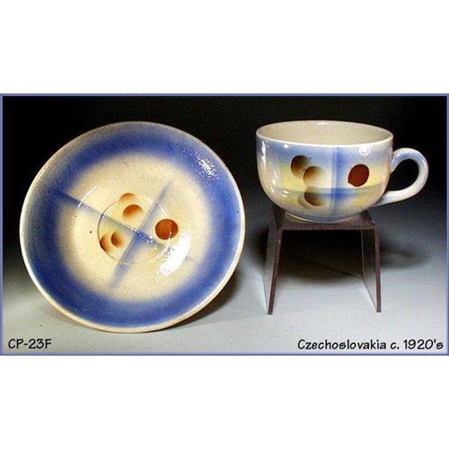 If you are REALLY interested in this item, please note that for Ebay Live Auction only bids at or above $180 will be successful and meet our reserve. 4 Scarce Vintage Art Deco pottery cup & saucers with geometrical airbrushed pattern. Very good condition, no chips, cracks or repairs. Unsigned, but guaranteed to be Czechoslovakian of the 1920-30's vintage. Please note that lots of our merchandise was acquired in Czechoslovakia and almost all pieces made for their domestic (Czech) market were not "signed". Dimension : Cup is 5" wide over the handle and 2-1/2" high, saucer is 6-1/4" in diameter. Pictured is one C & S, but you are buying set of 4. Please note that in some cases photo sizes are automatically reduced, so if you want to see full size or detailed pictures, please email us ().