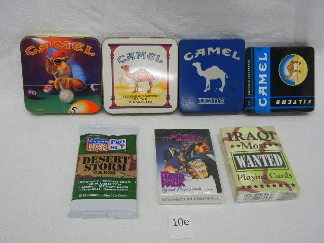 4 Camel Cigarette Tins, Camel Playing Cards, Desert Storm Pro Set, and Iraqi Most Wanted Playing Cards