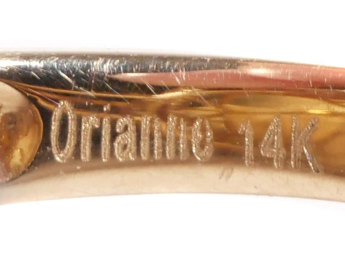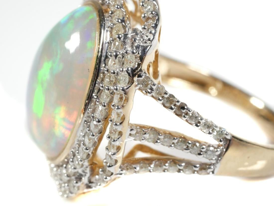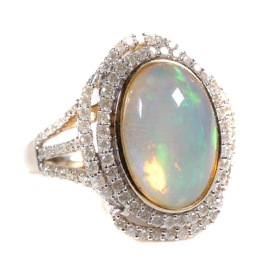 4.03 carat opal cabochon framed by .86 karats of diamonds. Size 8.