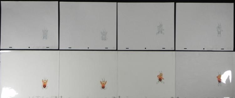 Commercials for Cheerios have been a mainstay of Saturday morning * cartoon programming for many years. They generally depict the mascot * tempting a hapless child or adult with a sparkling bowl of Honey Nut * Cheerios, and their attempts to compete for it. * Offered here are four different original animation cels and drawings * from the production of the Cheerios * commercial. * * Phew, that was a close one... * Original Animation Cel and * DrawingOriginal "rough" animation drawing in black * and non-photo blue pencil with the notations in * blackSize of cel: 10 1/2" x 12 * 1/2"Overall size is a 12-field drawing that is 10 * 1/2" x 12 1/2"Overall condition: Excellent * * * The cel and drawing are ready to be matted and framed. The * animator's notations are located at the bottom of each. *