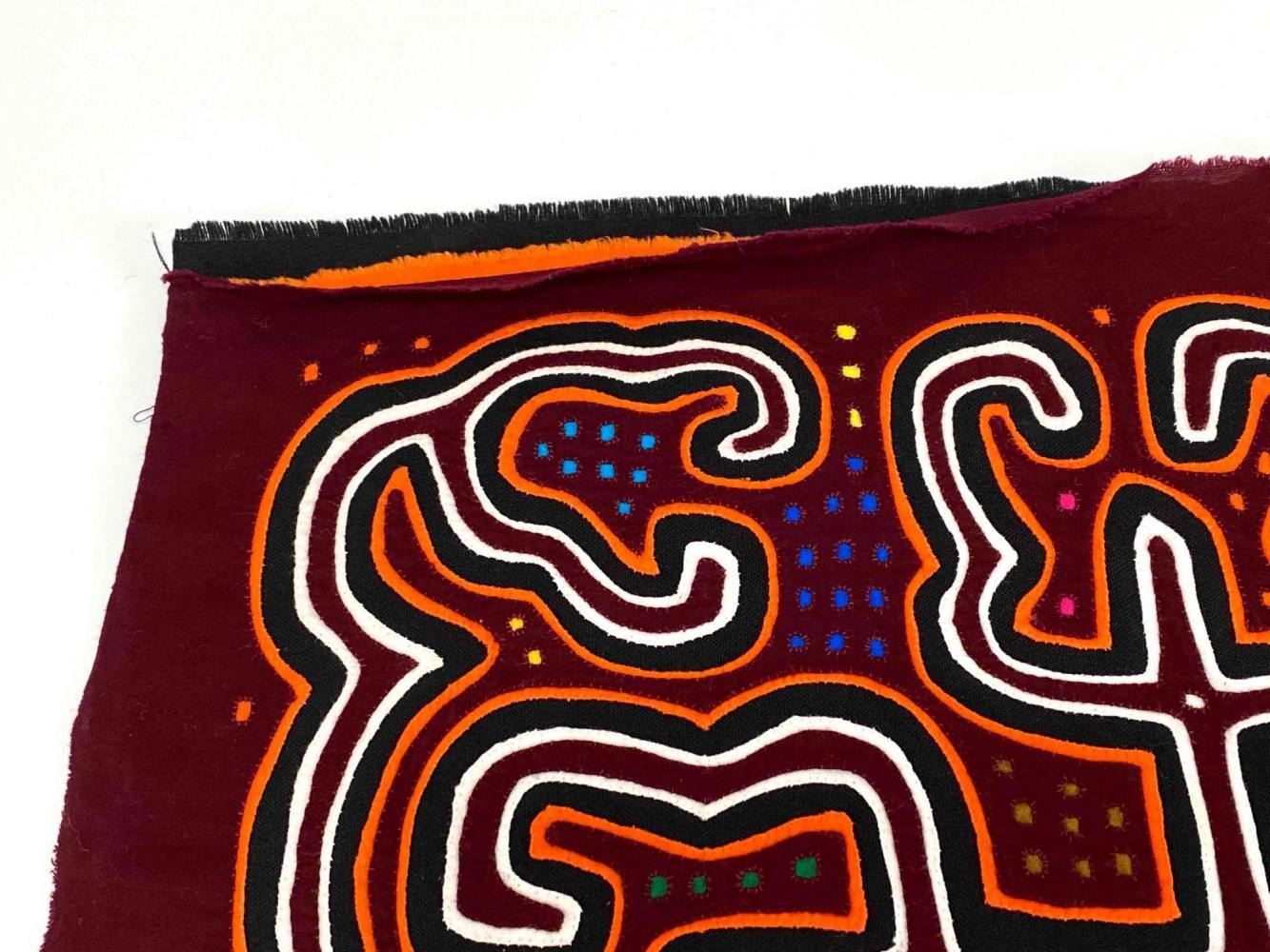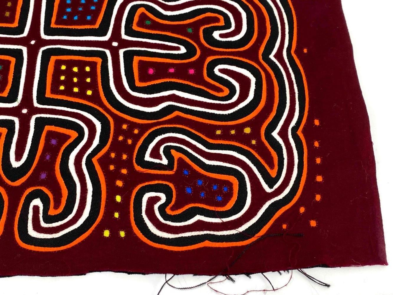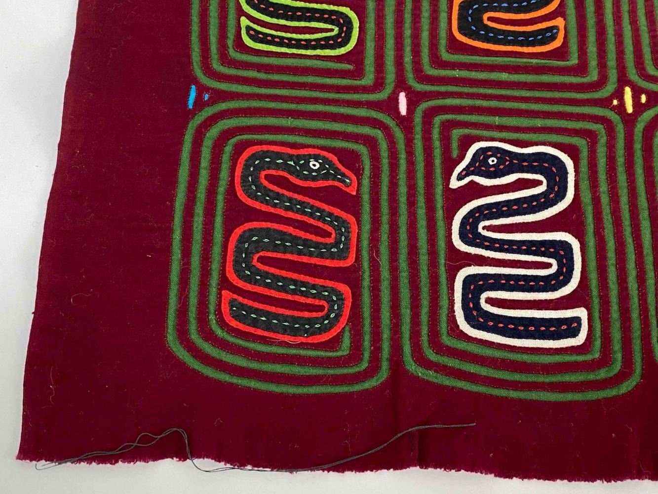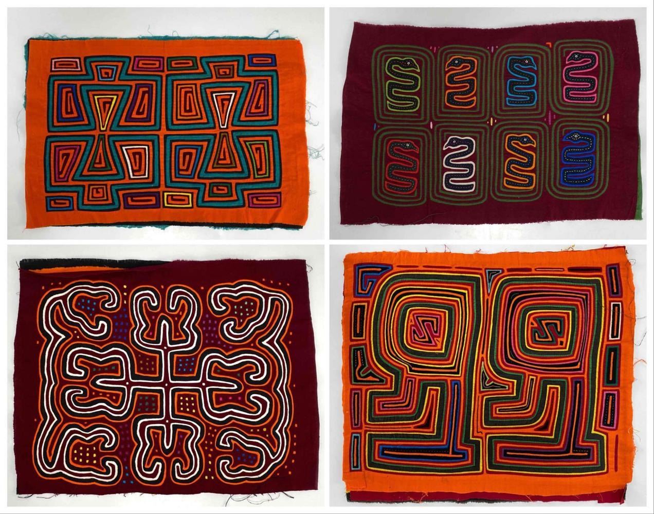 4 Central American Hand Stitched Mola Textiles With Geometric And Snake Designs. Largest Approximately 17.75L x 15.5W in. Smallest Approximately 16.625L x 11.125W in.