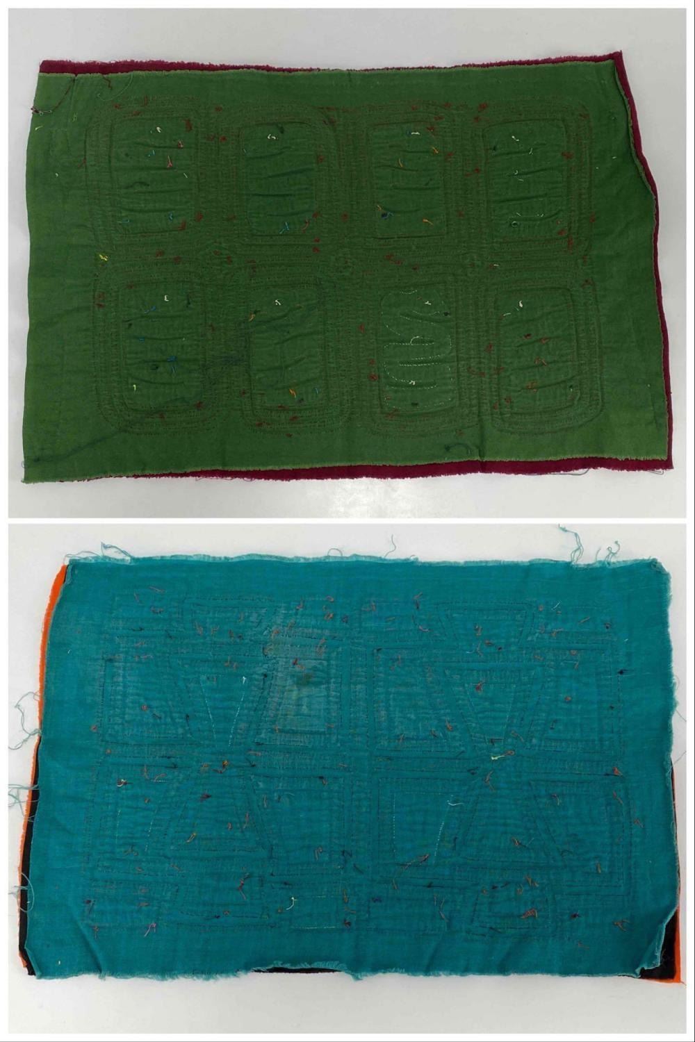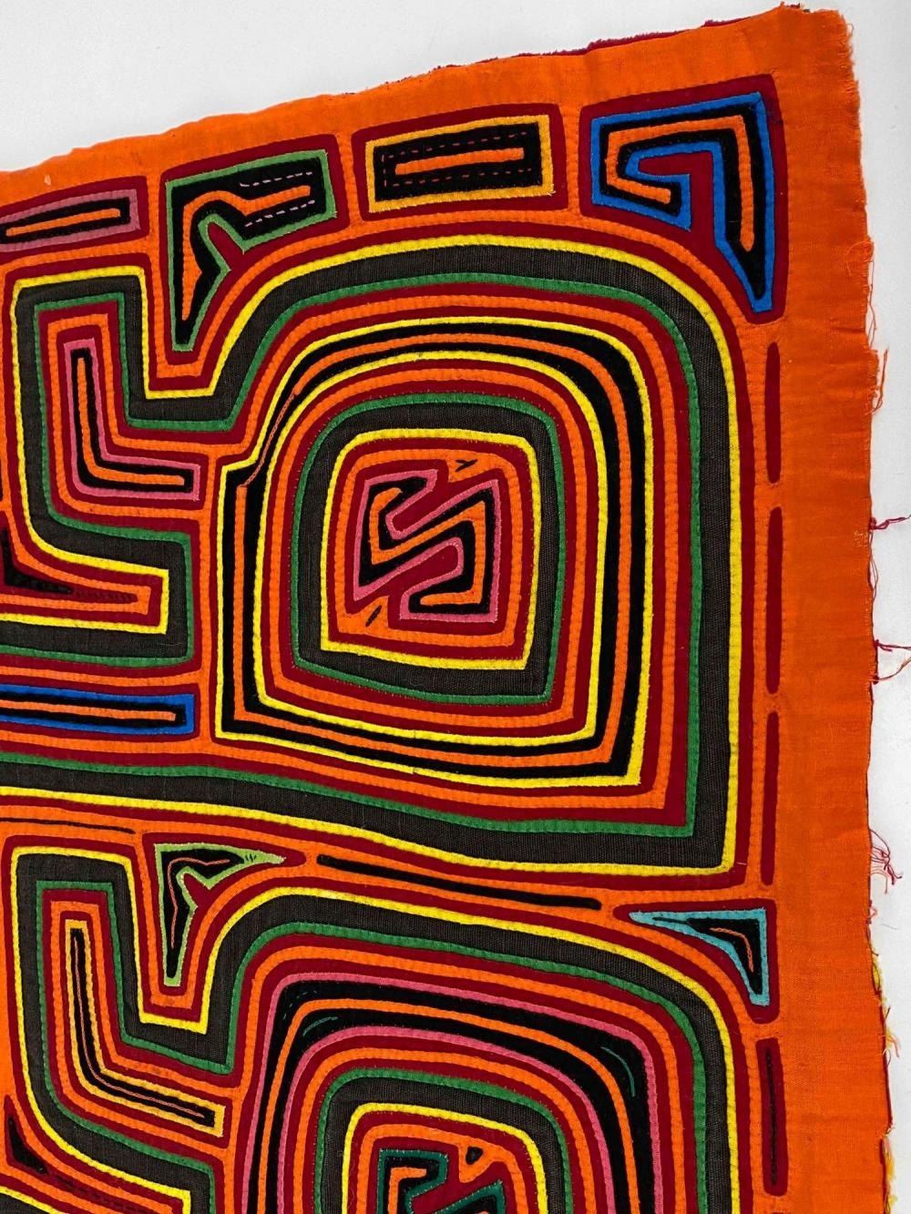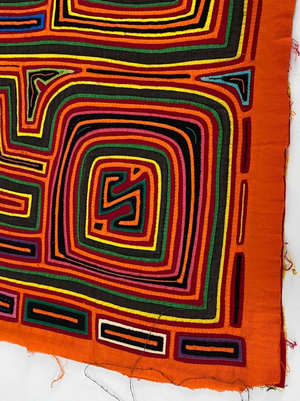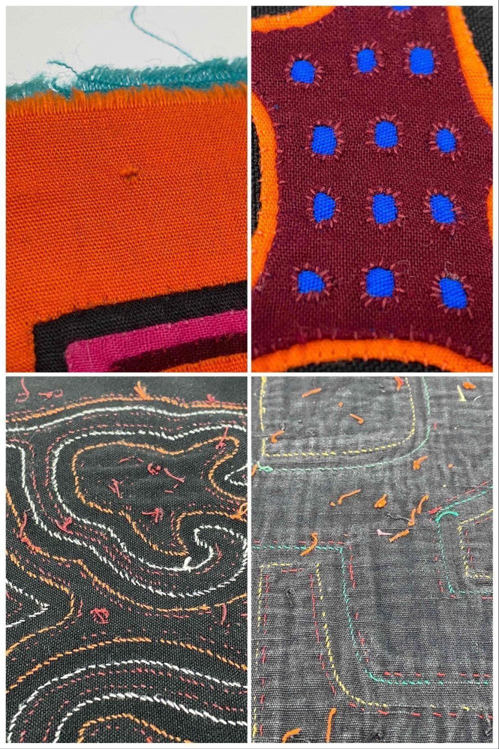 4 Central American Hand Stitched Mola Textiles With Geometric And Snake Designs. Largest Approximately 17.75L x 15.5W in. Smallest Approximately 16.625L x 11.125W in.