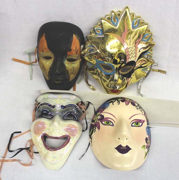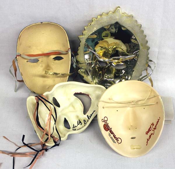4 Ceramic Masks. Get your next 4 Halloween costumes with this group of beautiful masks. There is a brilliant gold and glitter mask, a black and glitter mask, laughing comedian mask and beautiful flower hair girl mask. This one is signed on the back ''Designed by Anitra Yesovitch'' from the Iron Mountain Enterprises. The comeidan mask is signed ''Sally New Orleans.'' The gold mask is the largest at 9''Hx7''W.