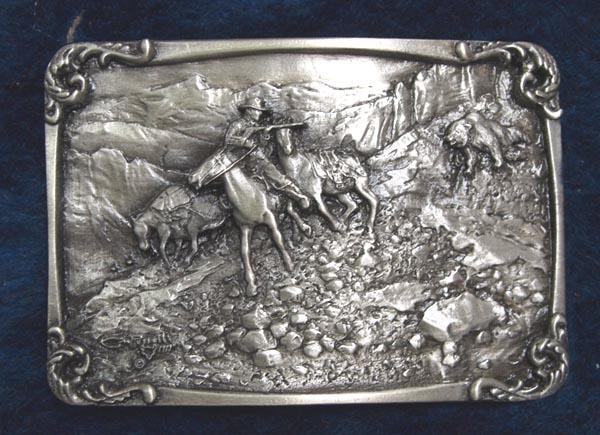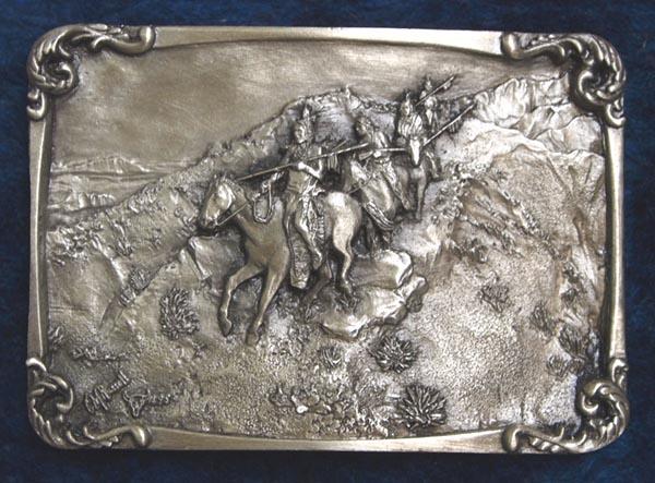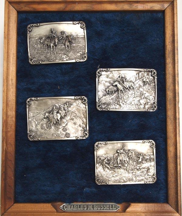 4 Charles Russell Pewter Buckles in Framed Display. Frame measures 12.5''x10''. Buckles are 2.5''x3.5''. SHI $20.