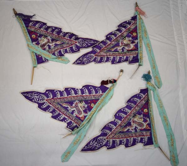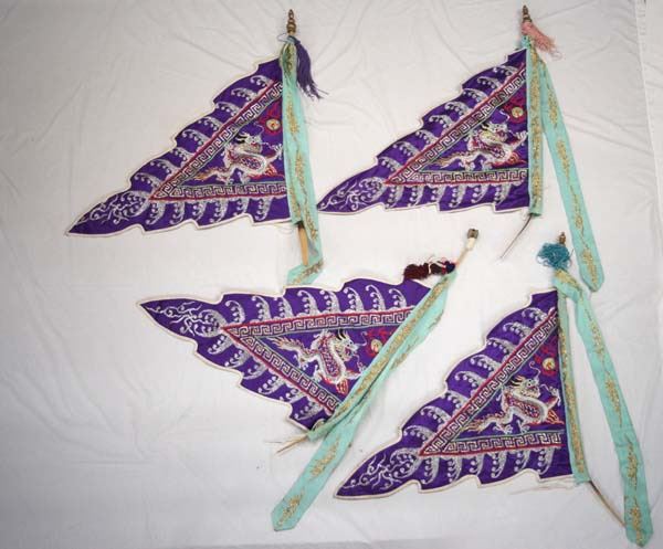 4 Chinese Embroidered Silk Dragon Flags, beautifully embroidered in silver and gold, decorated with fringe, decorative bent wood and steel rids, long silk streamers, gorgeous colors, measure 20'' x 27''