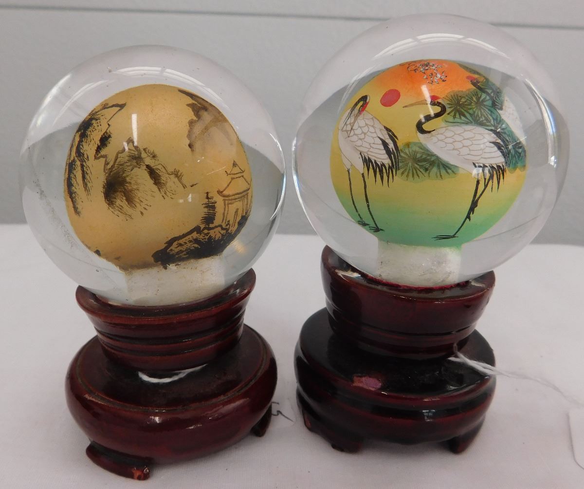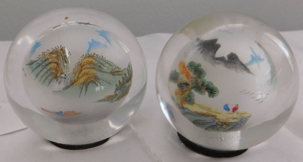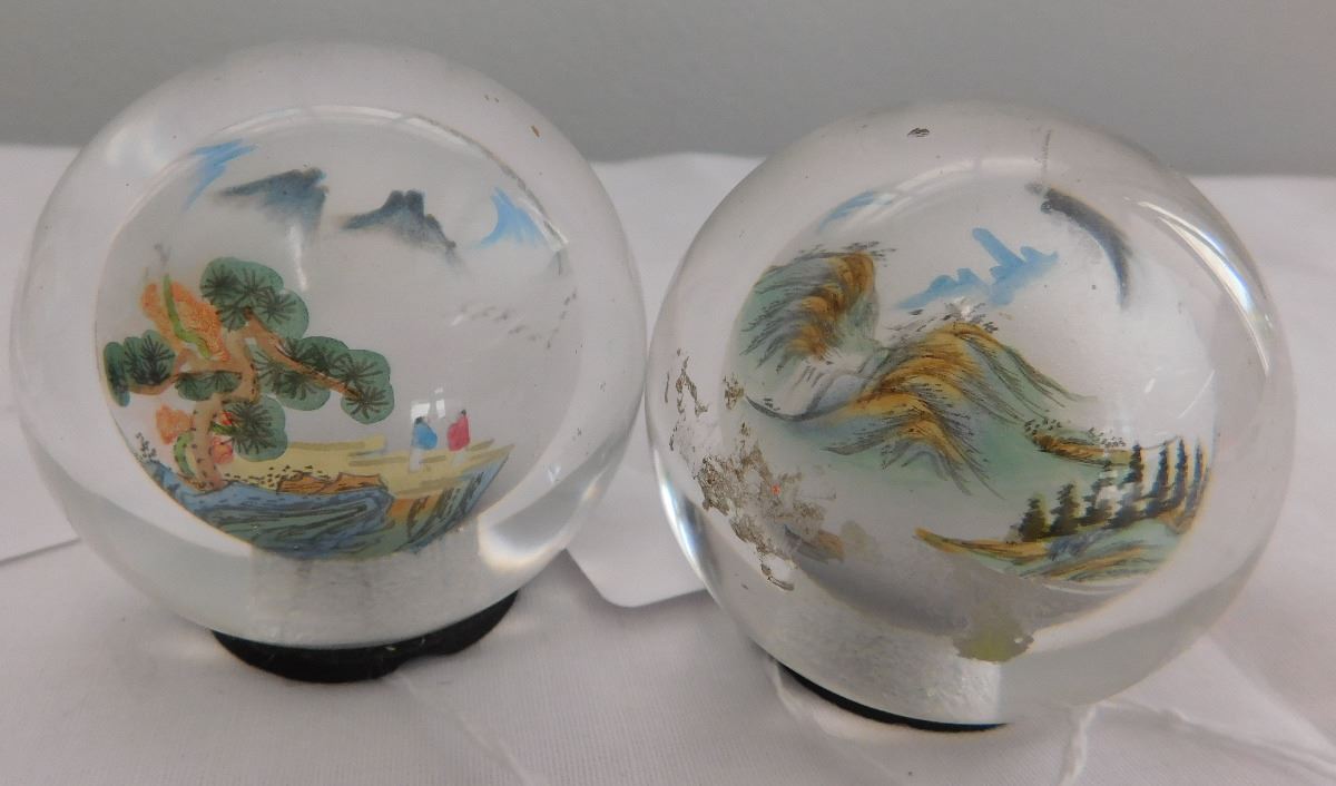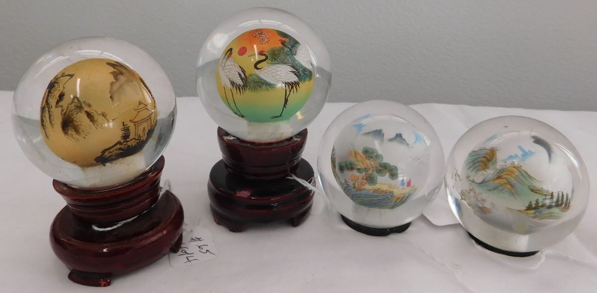 4 Chinese Interior Painted Spheres, mid-20th century items. These are made of glass and two have wood bases. Items are 3 1/2 x 2 1/4 and 2 1/2 x 2 1/4 inches. Condition: Good, see images. Shipping: $20.00.