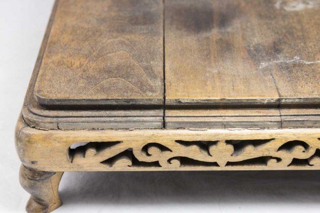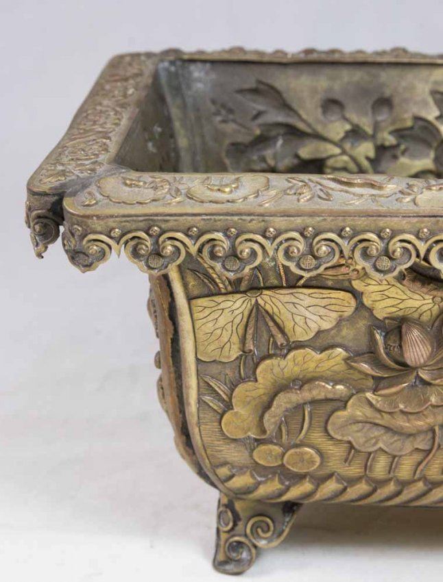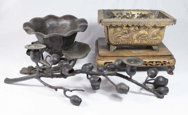 Including brass planter with floral design, approx. 5" H x 9 3/4" W x 7" D; metal flower form bowl and metal flower form candelabra, approx. 6 1/4" H x 20 1/2" L; and teakwood pedestal, approx. 3" H x 10 1/2" W x 8 1/2" D.