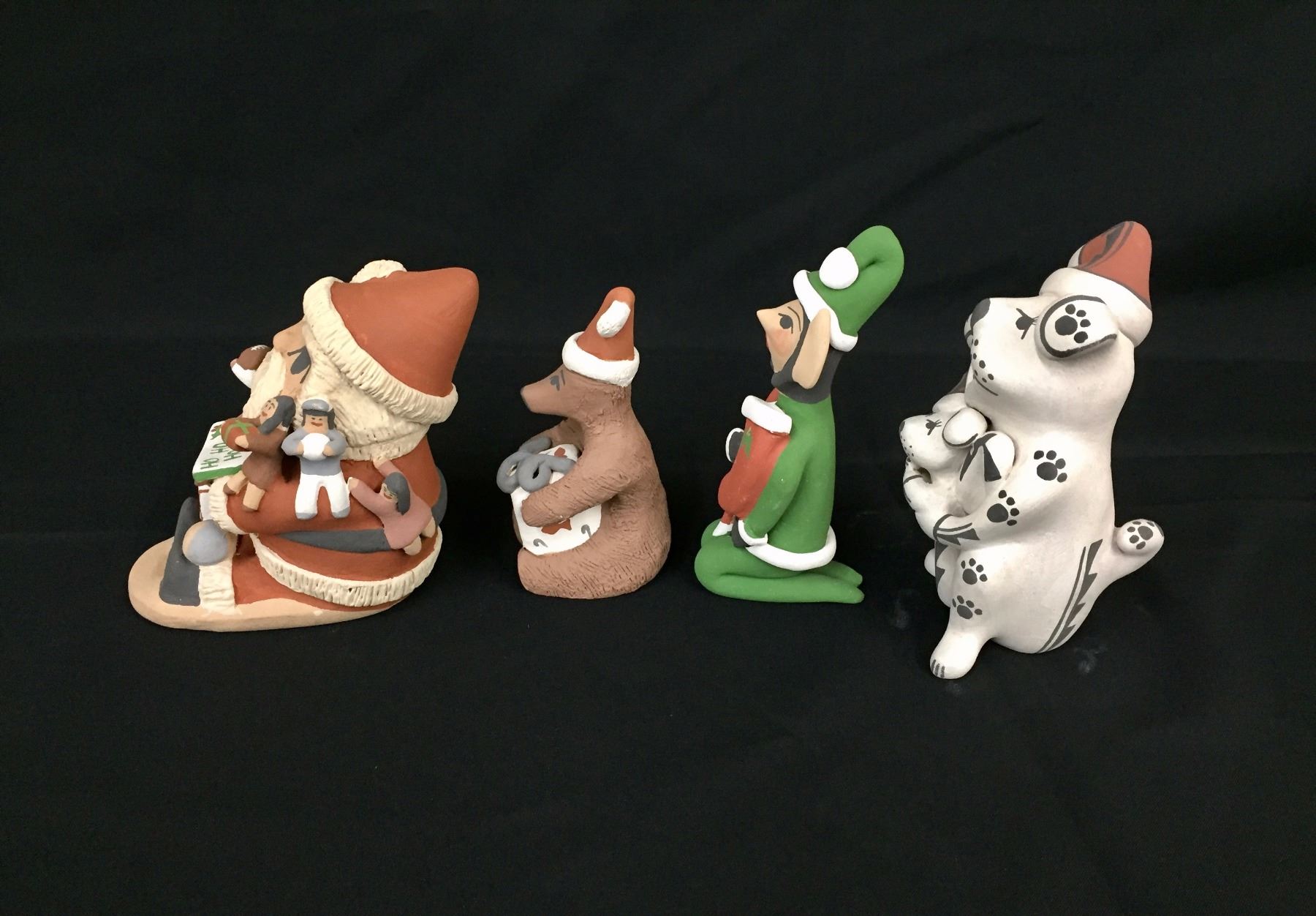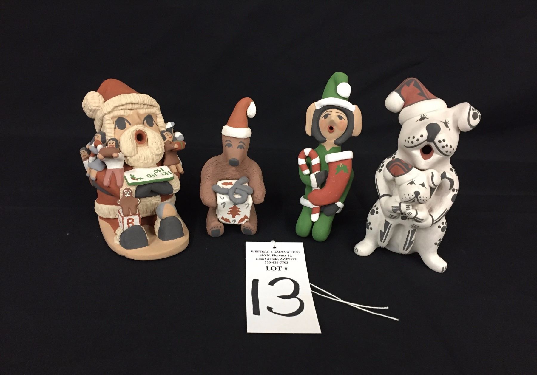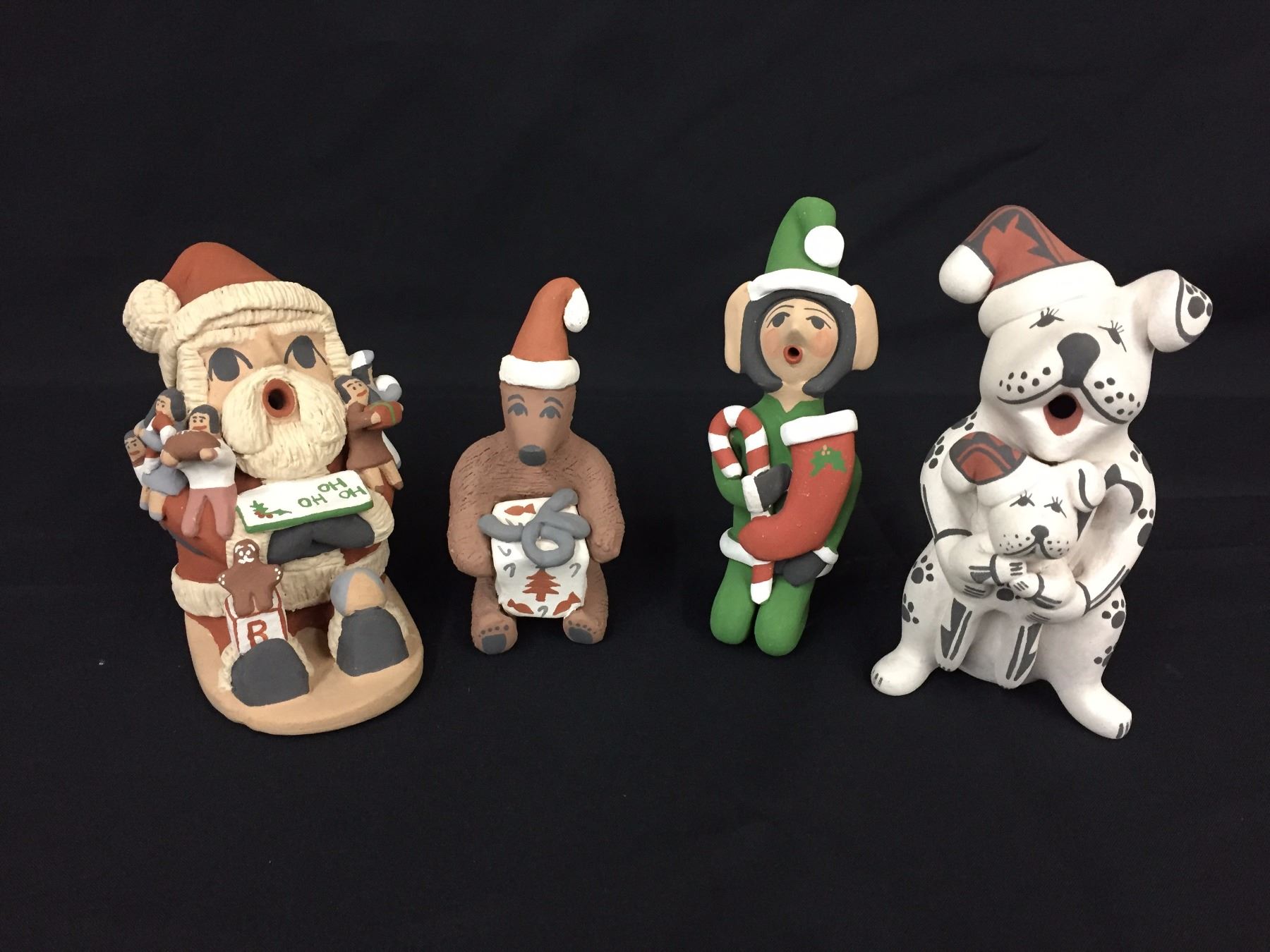 Maker: Various Jemez potters. Approx. Age: Fairly modern. Size: Each measures between 6” to 5 1/8” h. Additional Info: Hand made and painted Christmas theme pottery items, Santa, bear, dogs and elf. Condition: Good, normal wear expected. Please note hairline cracks in dog figure. Please look closely at the pictures - they are an important part of our description. Shipping: There will be a $10 handling / packaging fee for shipping this lot. The actual cost of postage will be added on top of that.