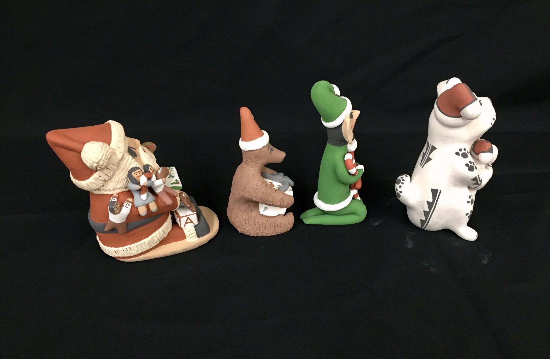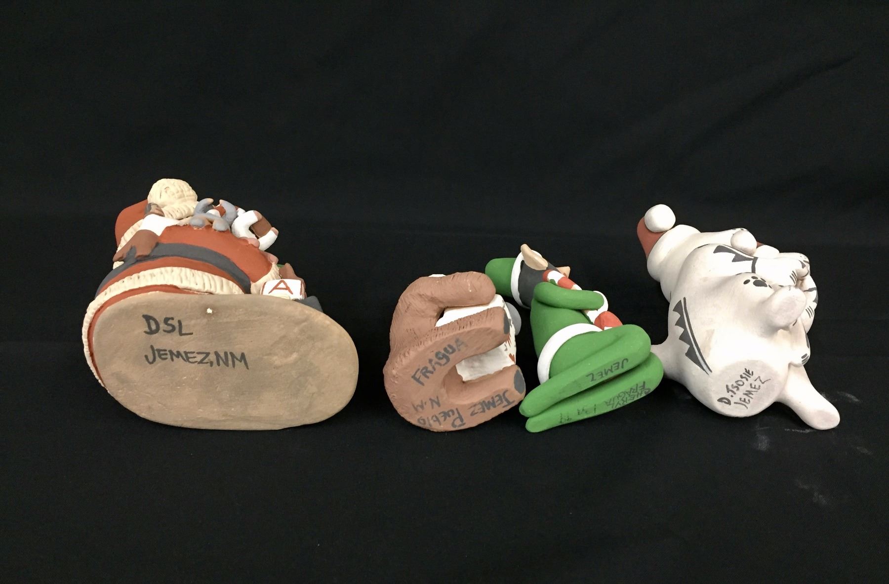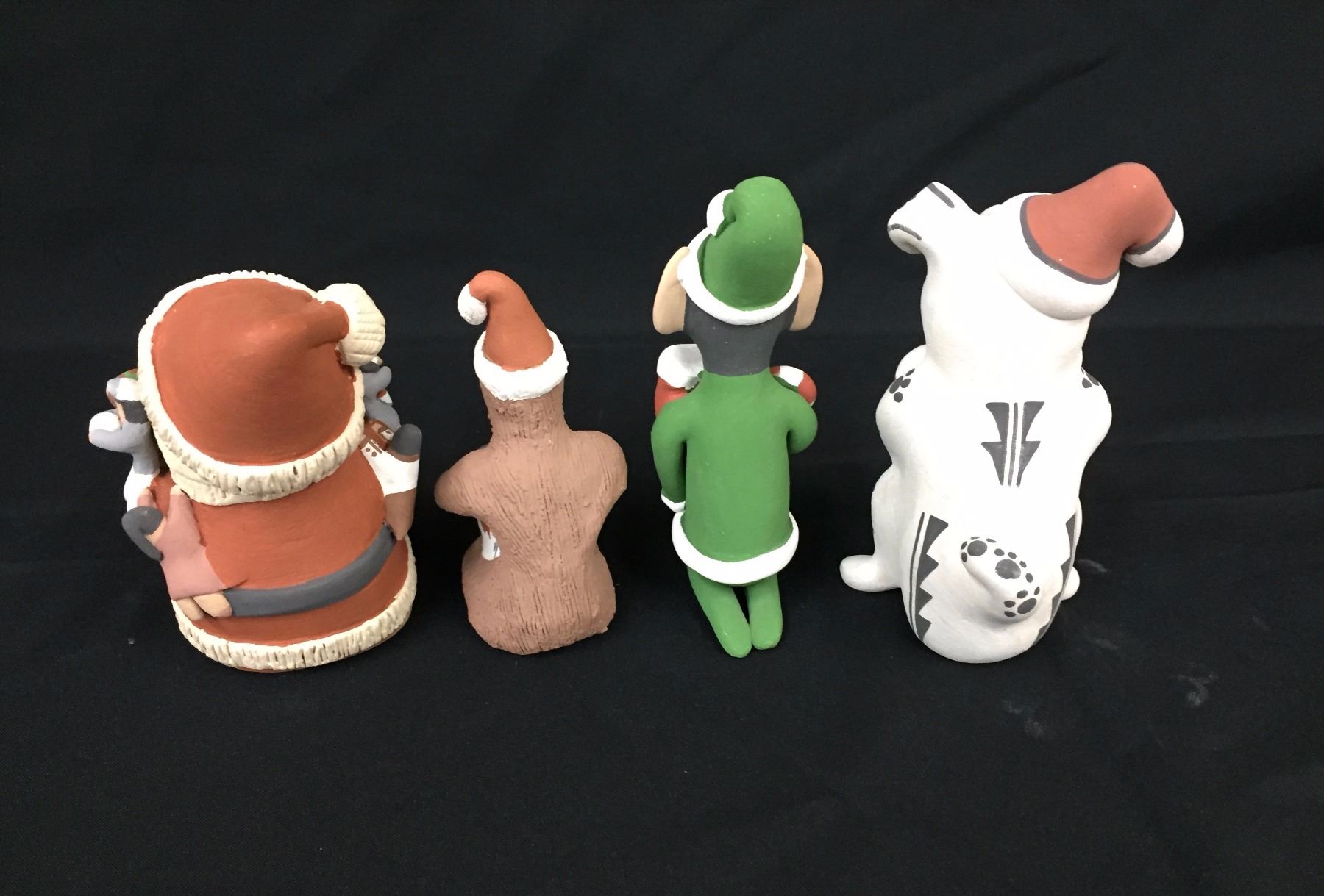 Maker: Various Jemez potters. Approx. Age: Fairly modern. Size: Each measures between 6” to 5 1/8” h. Additional Info: Hand made and painted Christmas theme pottery items, Santa, bear, dogs and elf. Condition: Good, normal wear expected. Please note hairline cracks in dog figure. Please look closely at the pictures - they are an important part of our description. Shipping: There will be a $10 handling / packaging fee for shipping this lot. The actual cost of postage will be added on top of that.