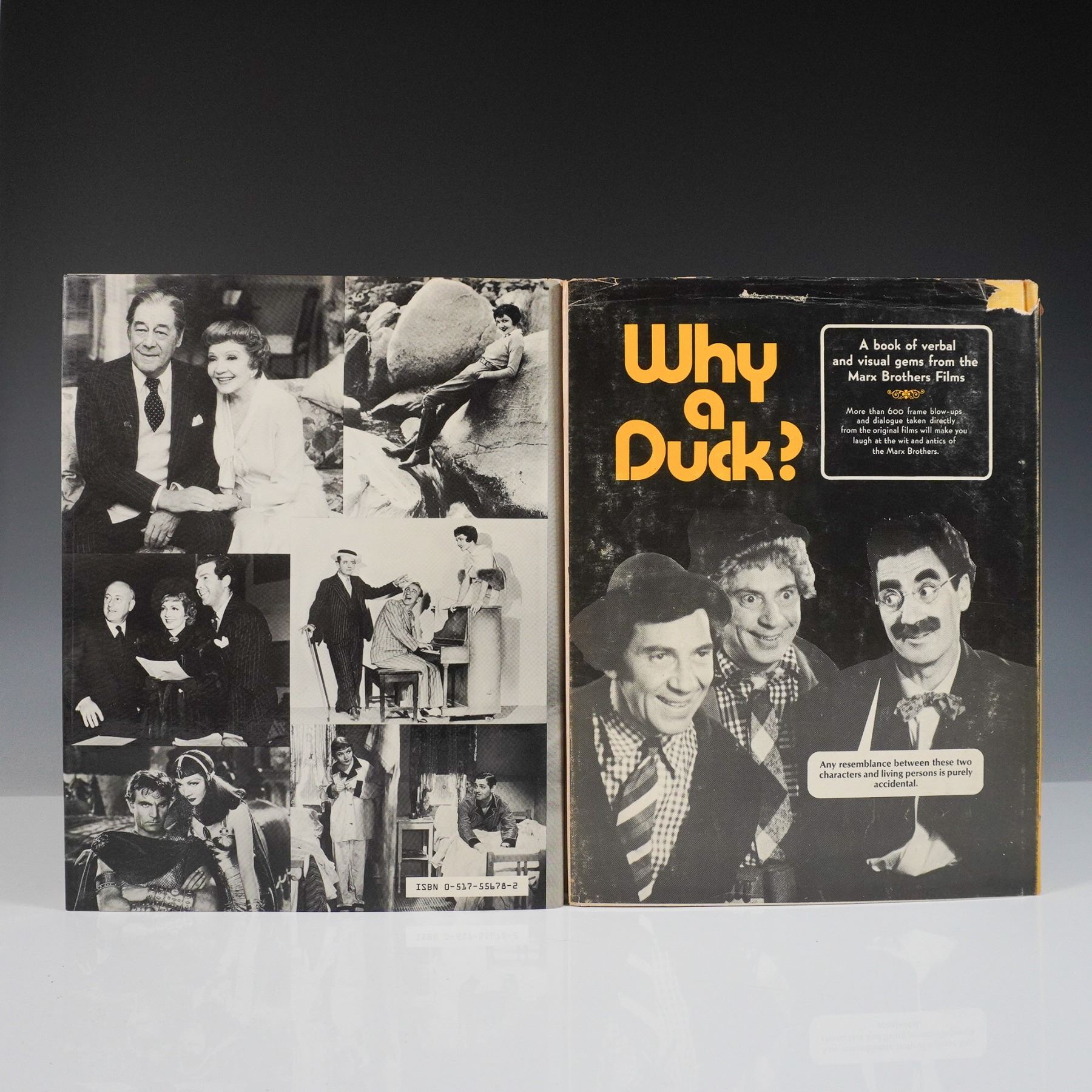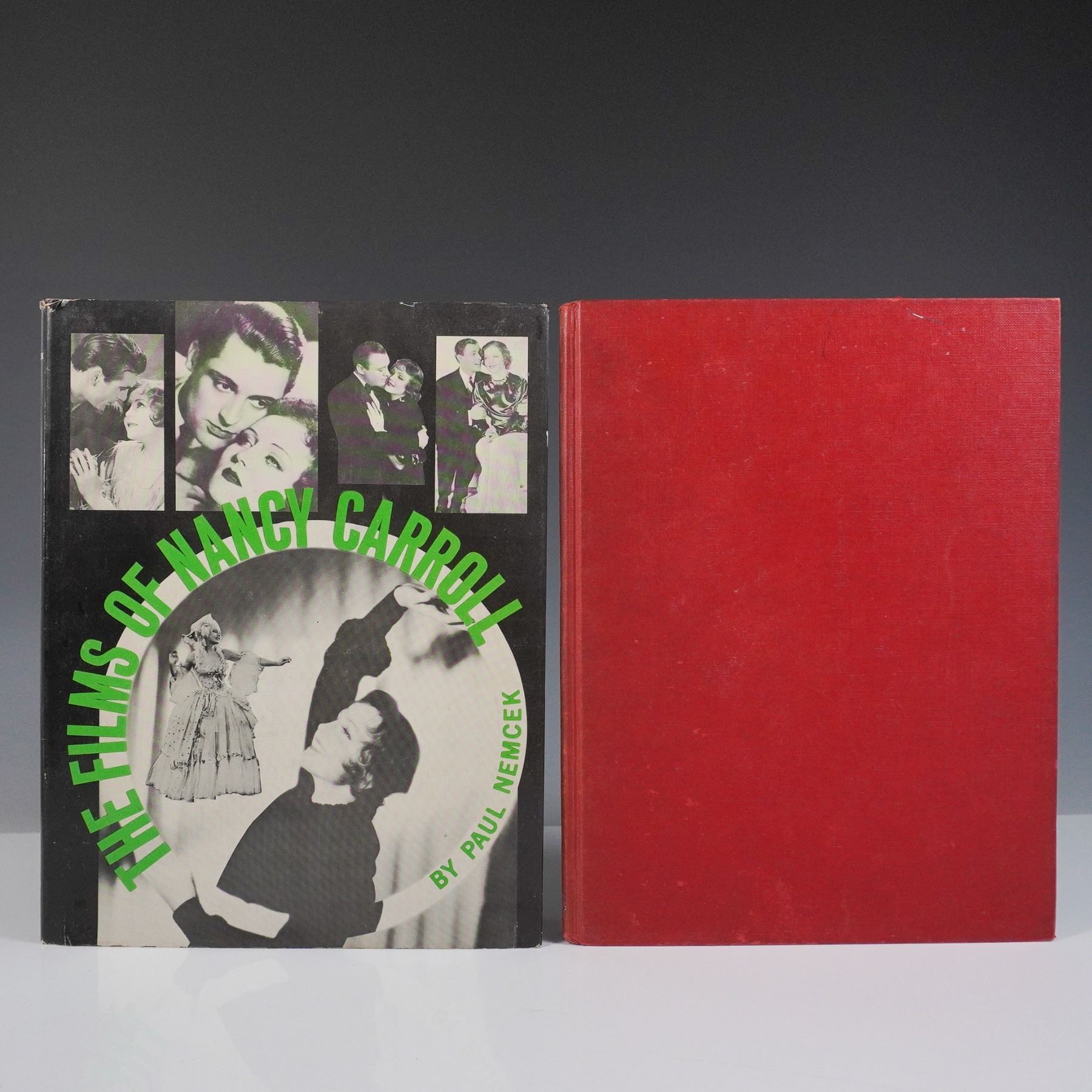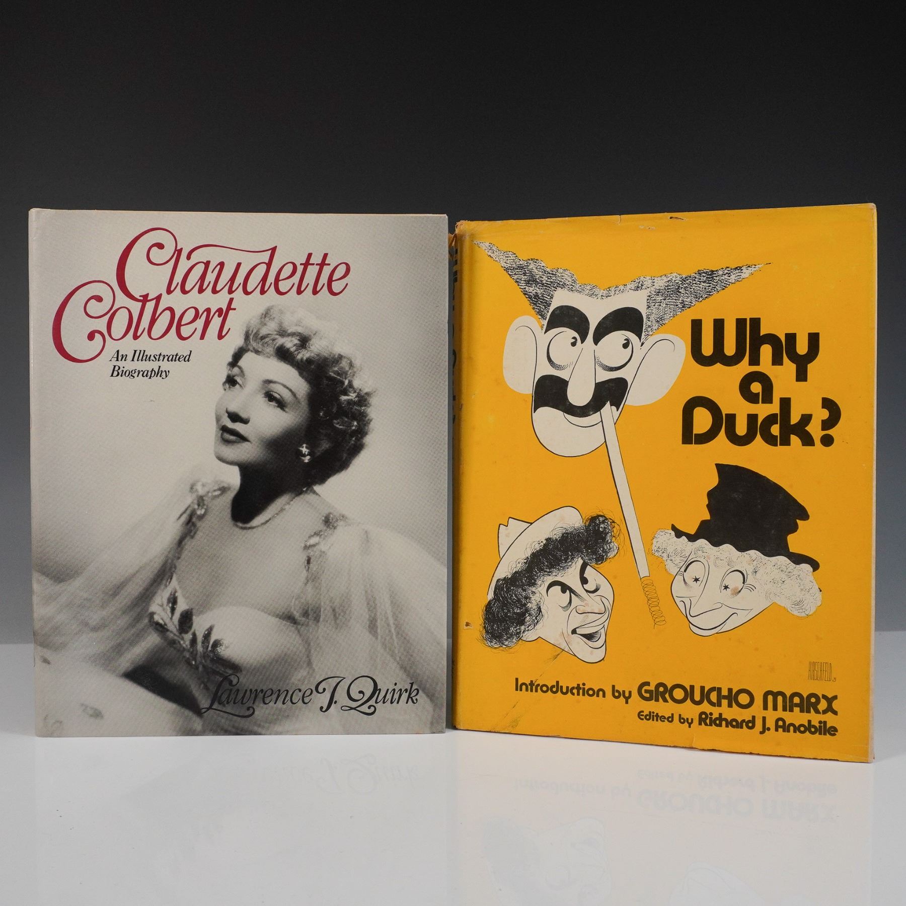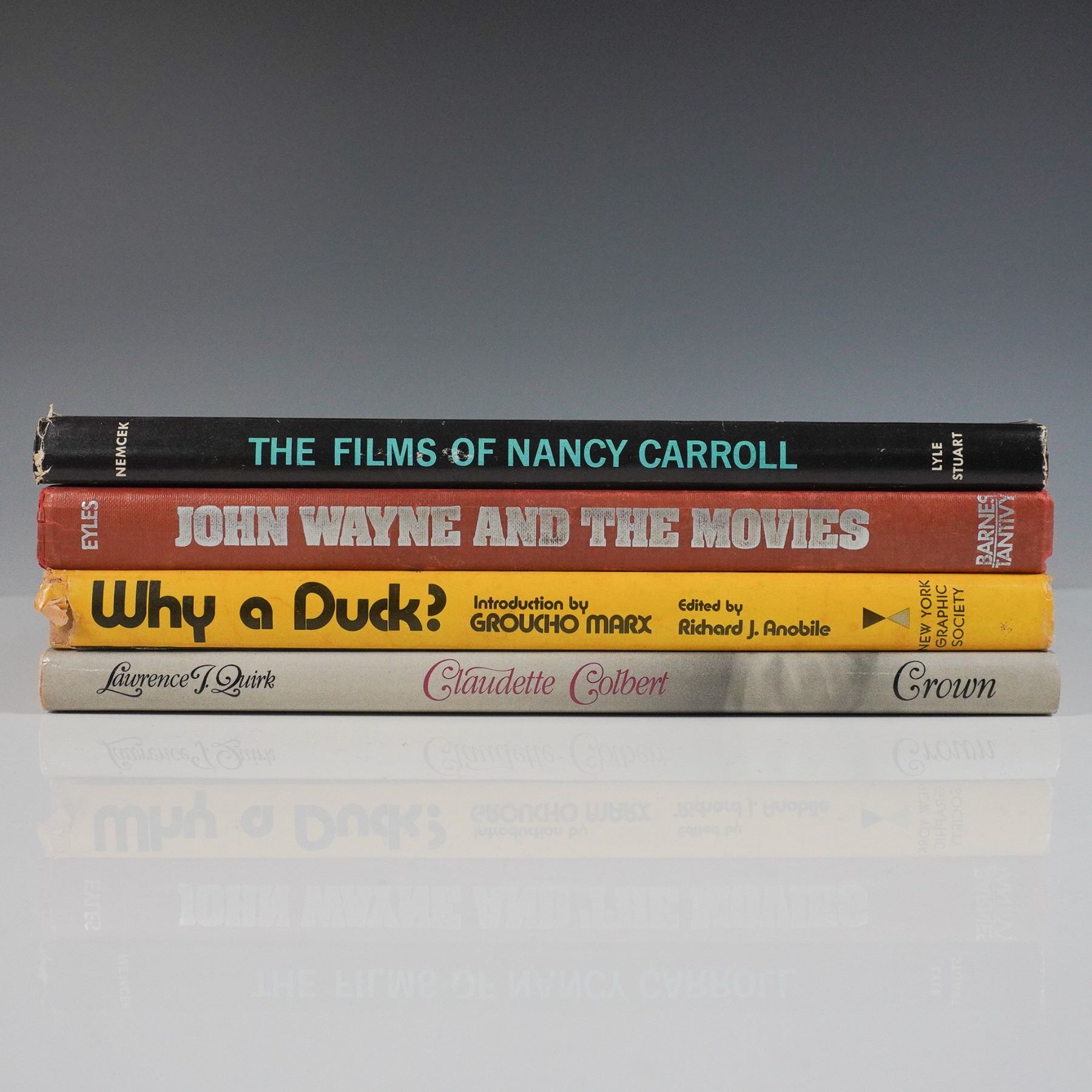 A collection of four books celebrating the golden era of Hollywood and its legendary stars. Titles include The Films of Nancy Carroll by Paul Nemcek (1969), Why a Duck? edited by Richard J. Anobile with an introduction by Groucho Marx (1971), Claudette Colbert: An Illustrated Biography by Lawrence J. Quirk (1985), and John Wayne and the Movies by Allen Eyles (1976). These volumes feature in-depth film analyses, rare photographs, and insights into the lives and careers of iconic actors. The dimensions of the collection measure: 11"H x 3.25"W.