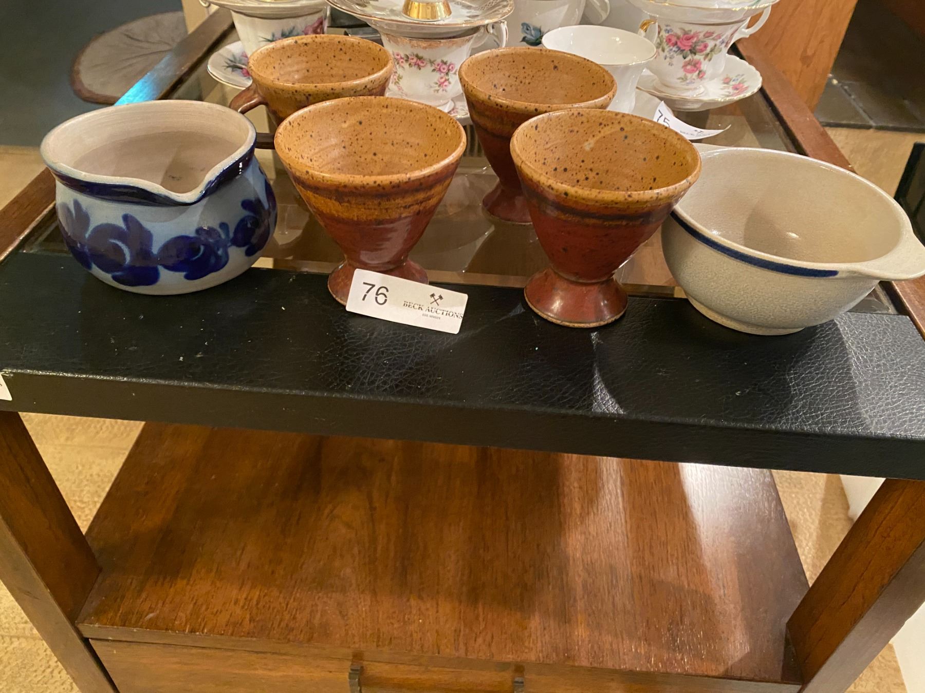 4 Clay Pottery Cups, 2 Bowls, Serving Platter