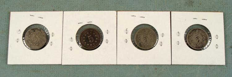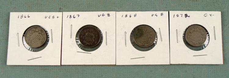 4 different date Shield NickelsDetails: Clear DateDates: 1866, 67, 68. 72