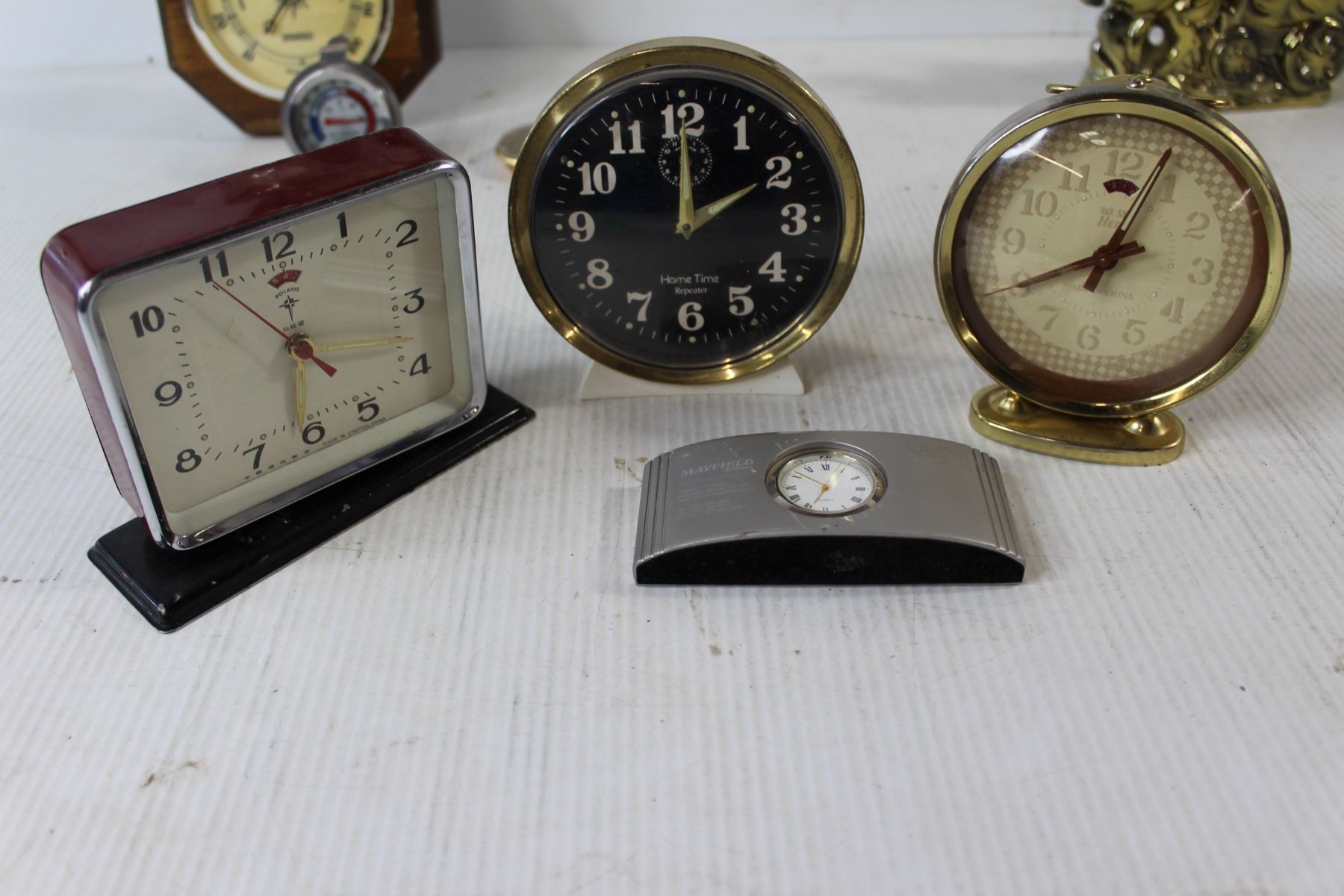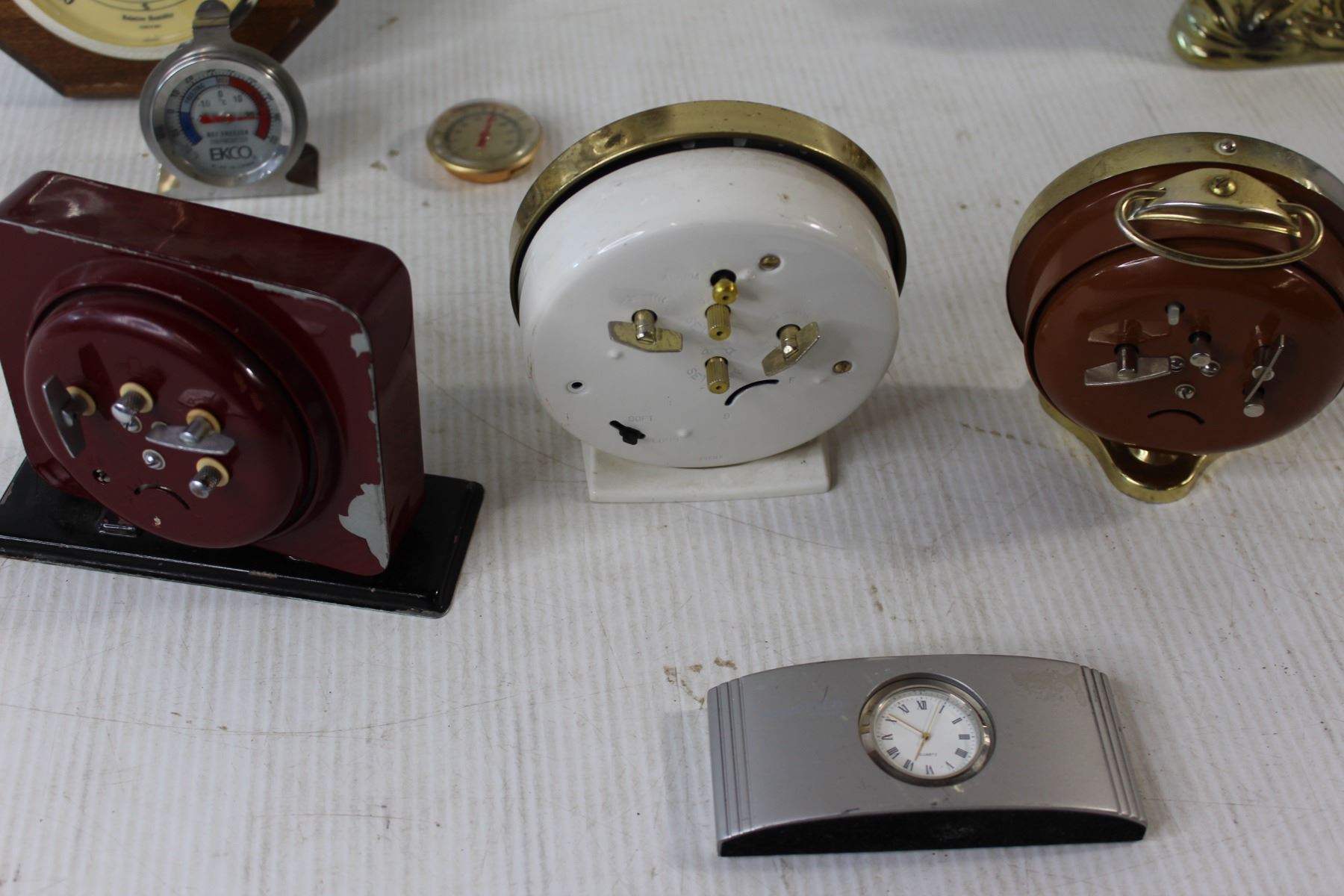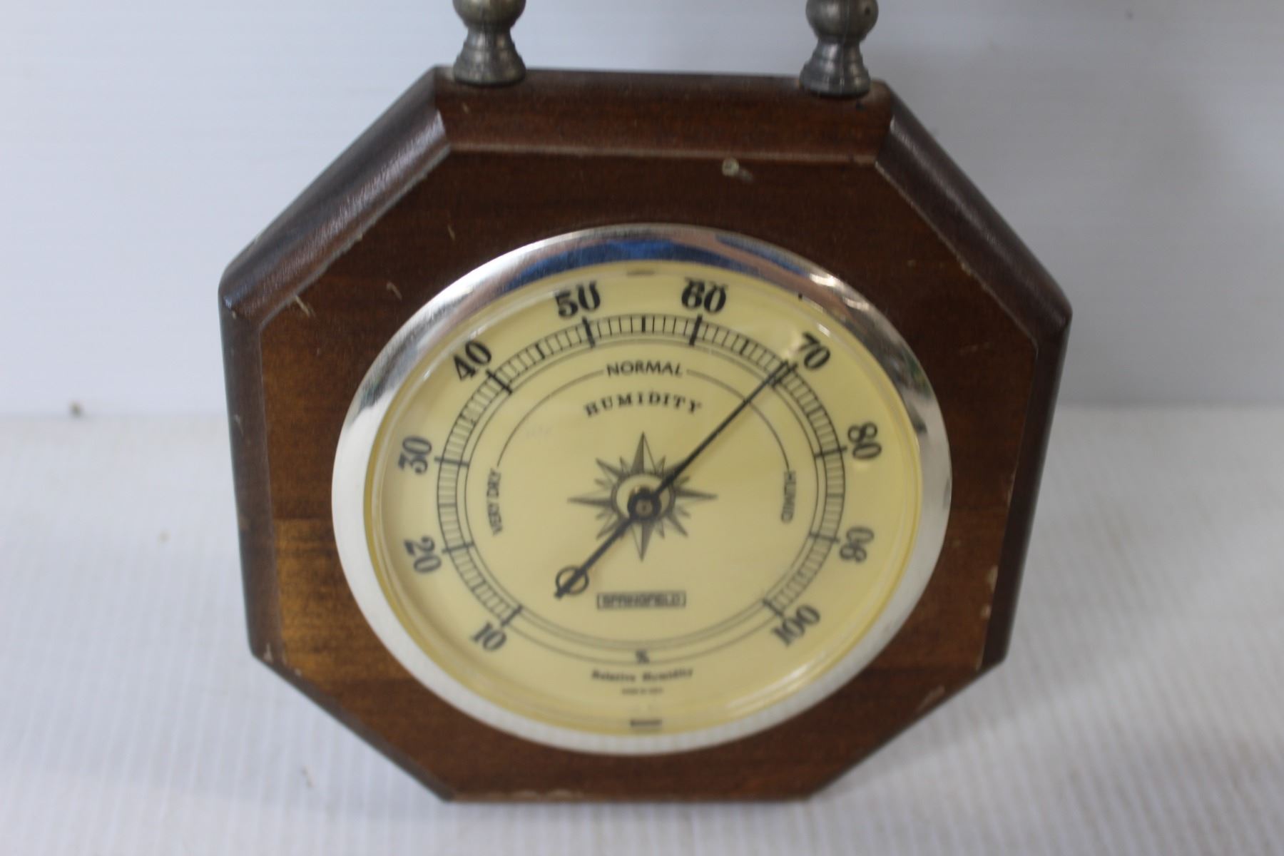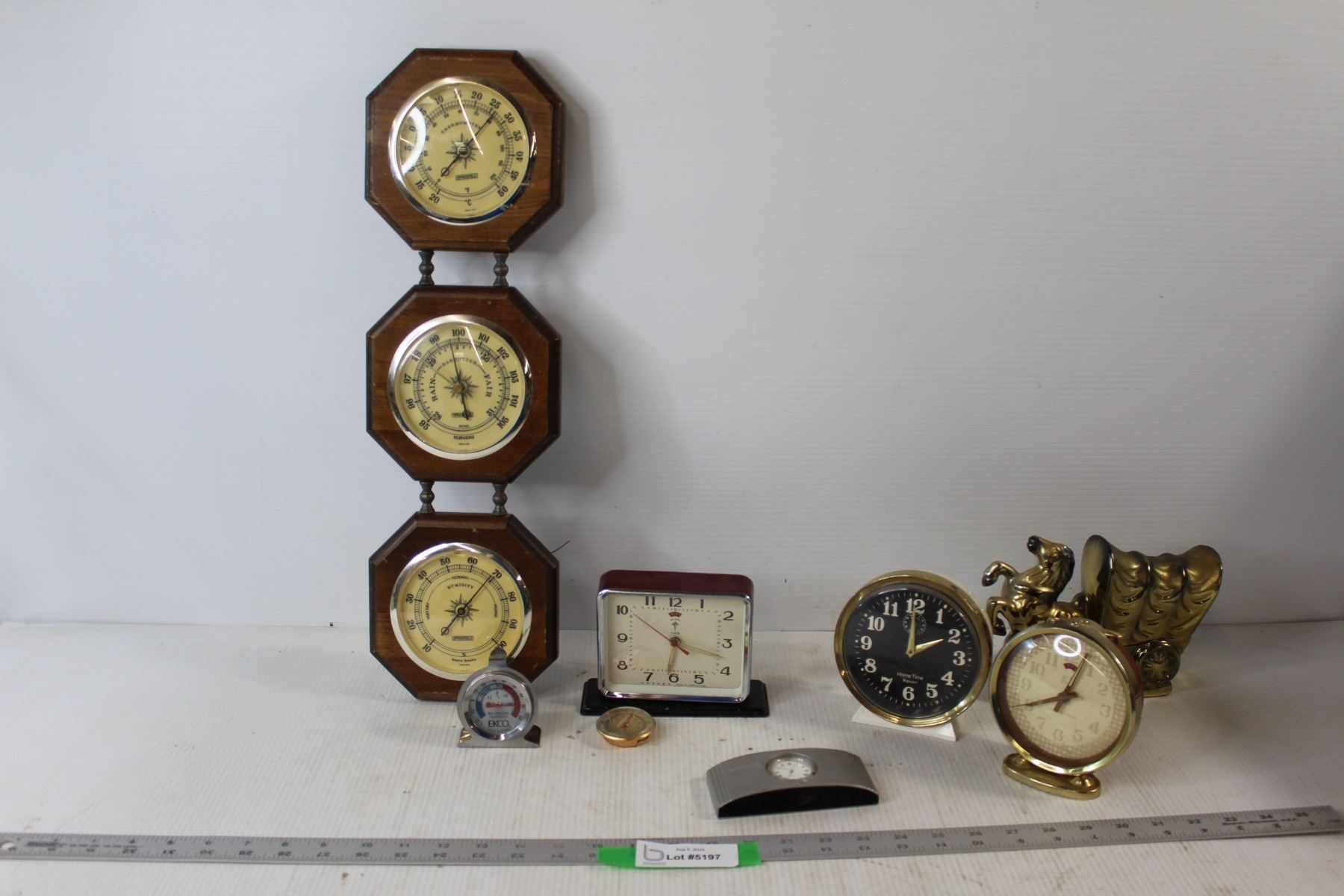 (4) Clocks, Horse Carriage Statue, (2) Thermometers, Springfield Stacked Humidity Checker/Barometer/