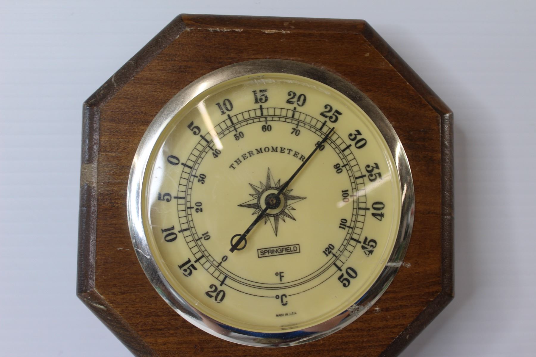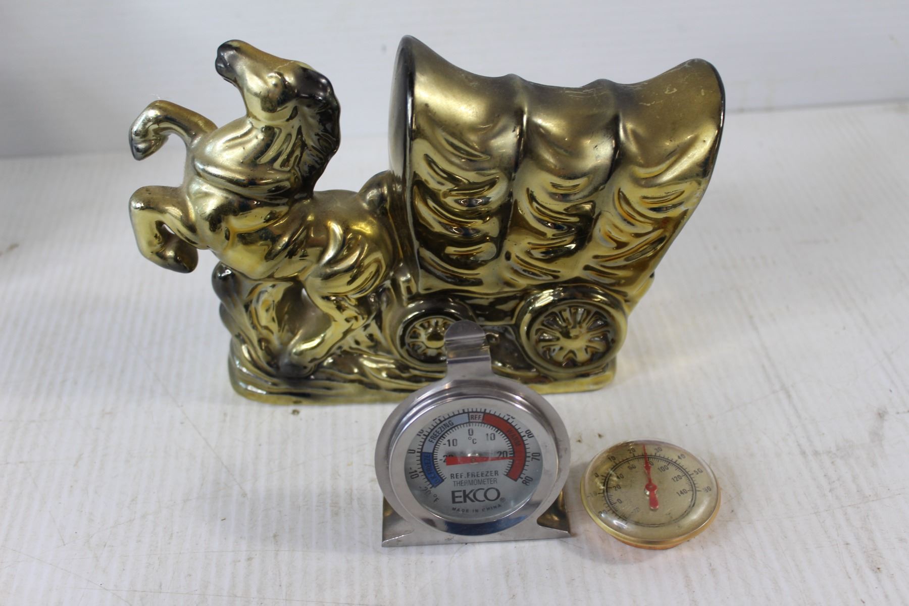 (4) Clocks, Horse Carriage Statue, (2) Thermometers, Springfield Stacked Humidity Checker/Barometer/Thermometer