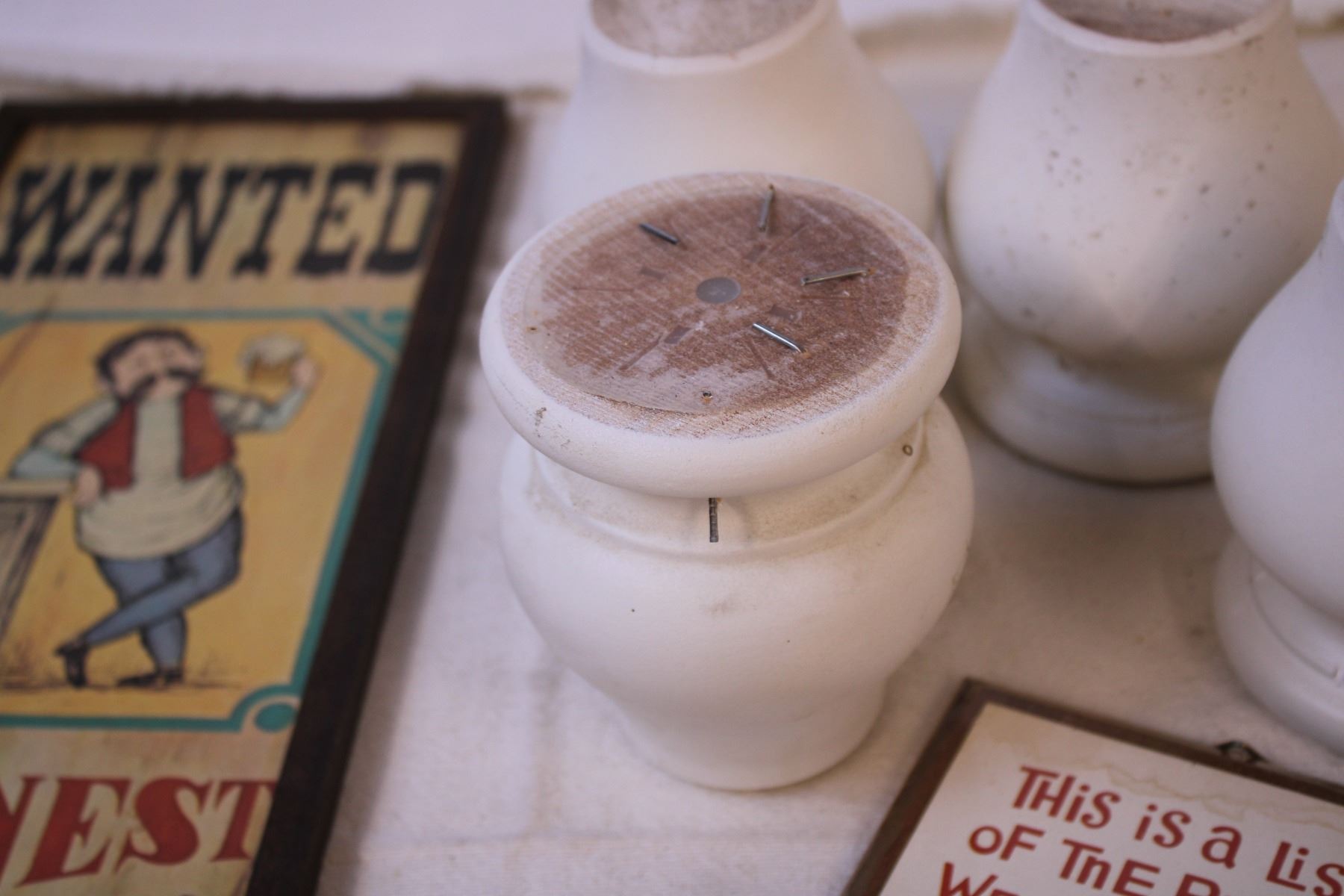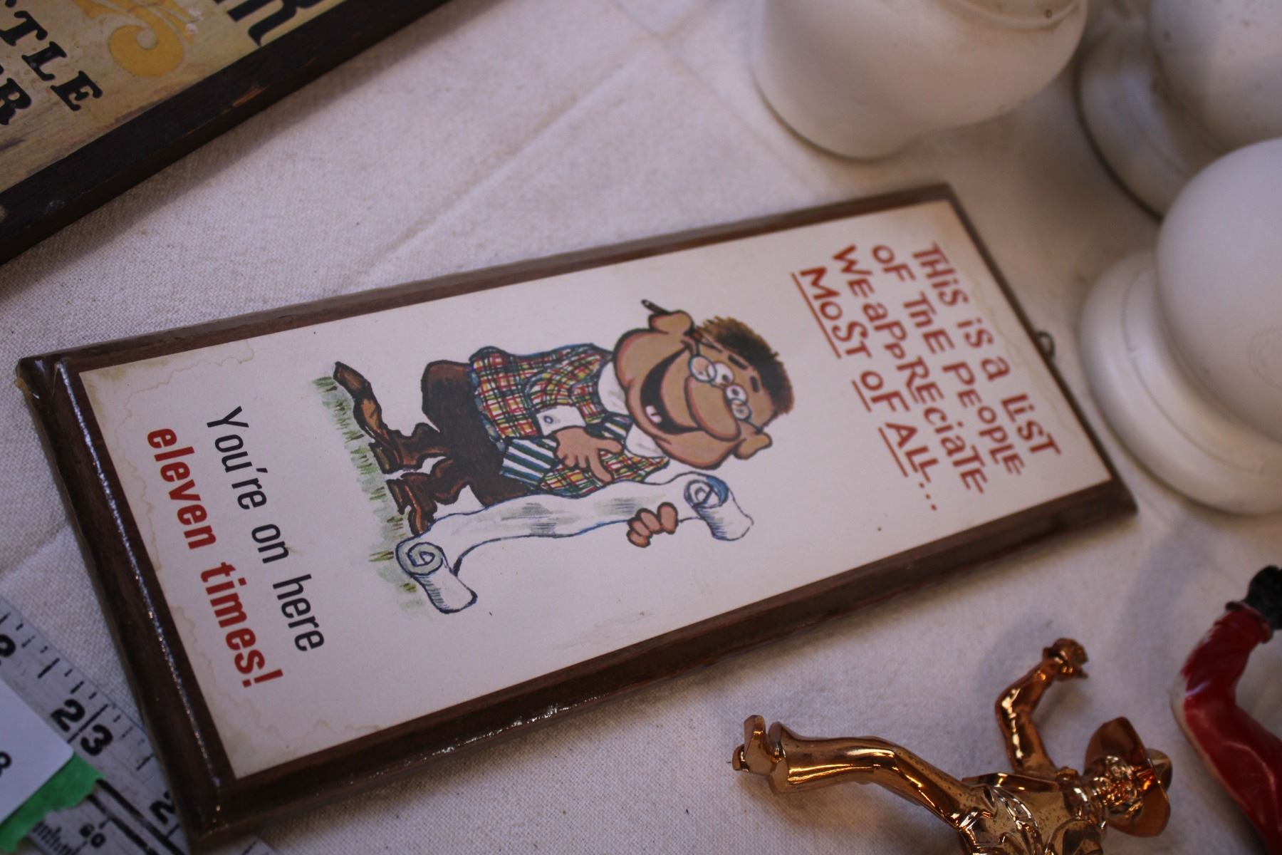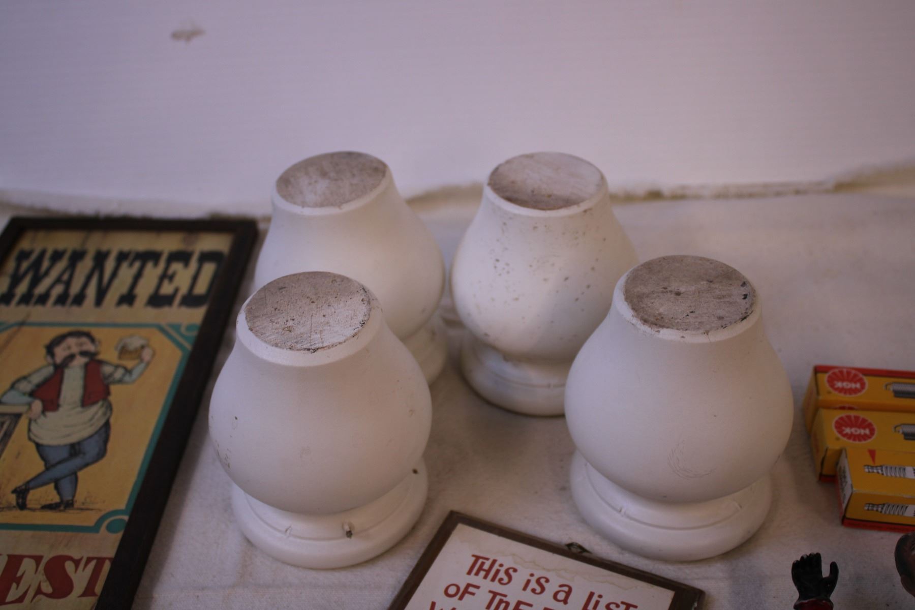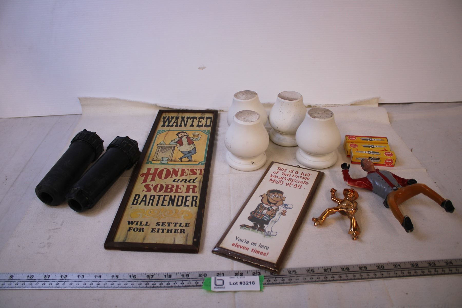 (4) Coffee Table Feet, (2) Signs, (3) Spark Plugs + Assorted Items