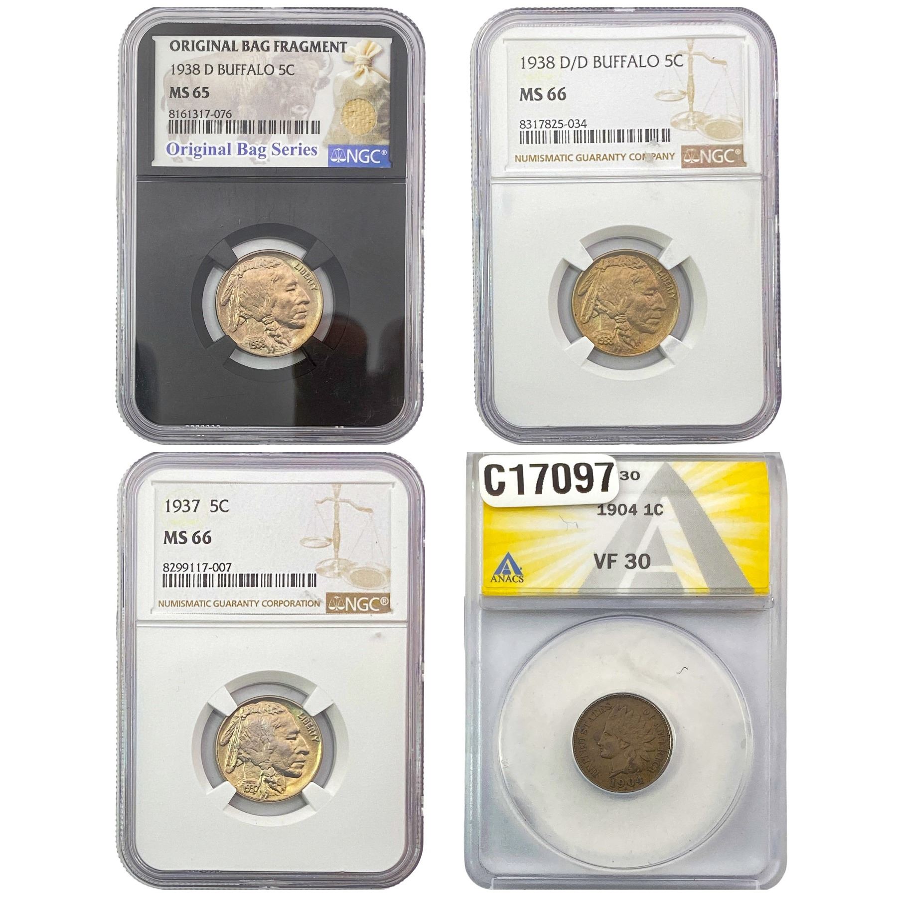 [4 Coins] 1904-1938 Indiand Head & Buffalo Coins ANACS/NGC VF/MS30-66