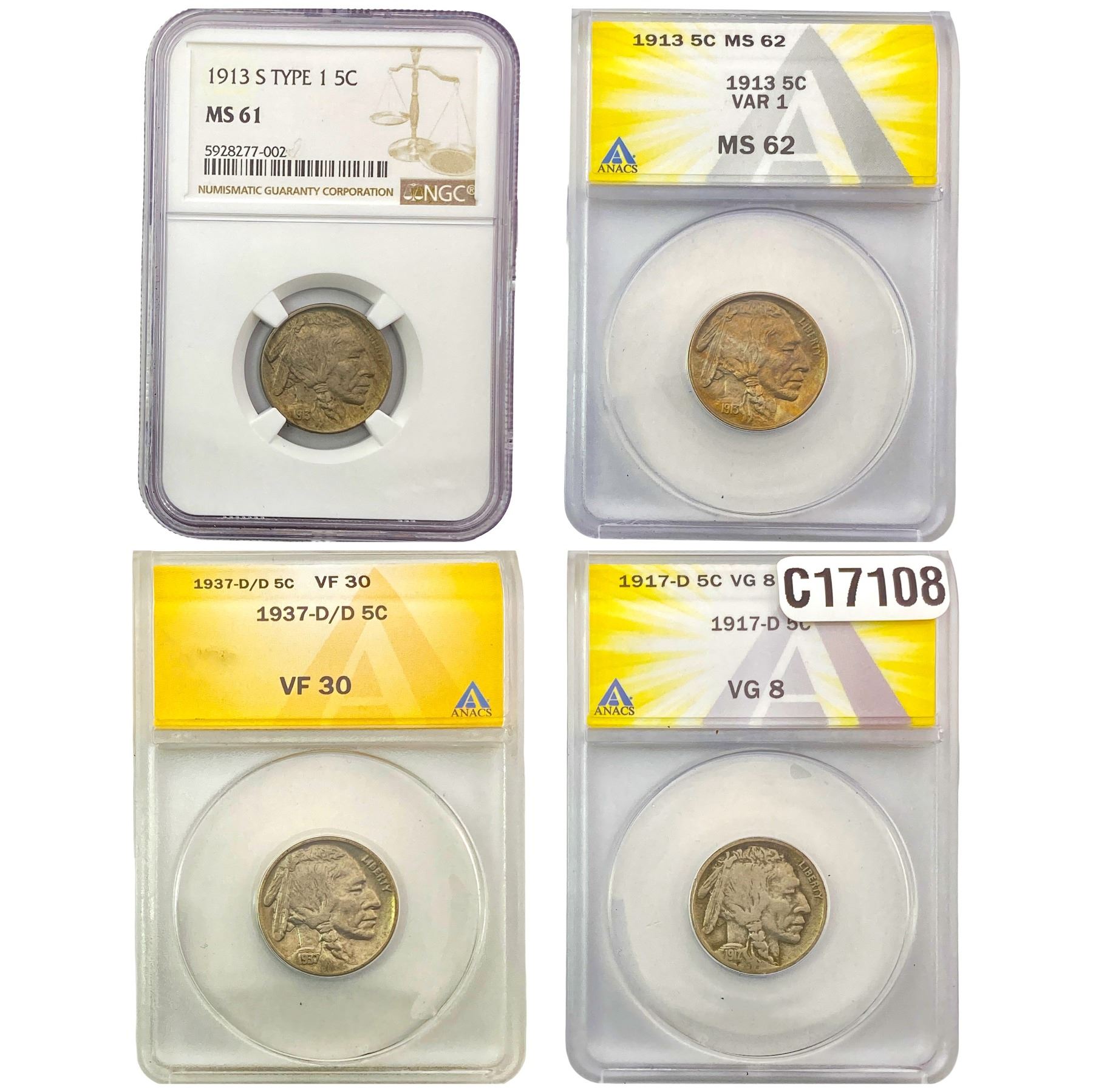 [4 Coins] 1913-1937 Buffalo Nickel ANACS/NGC VG/VF/MS8-62