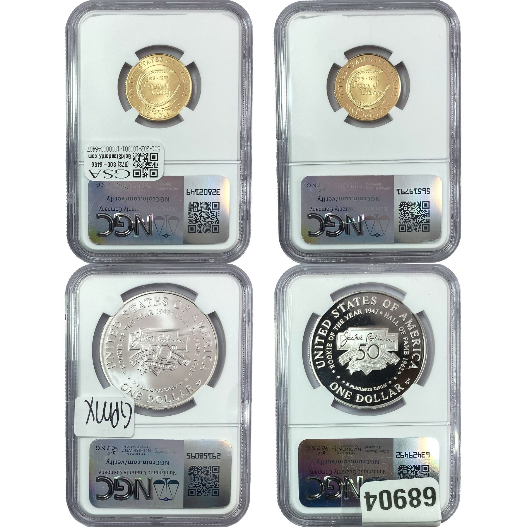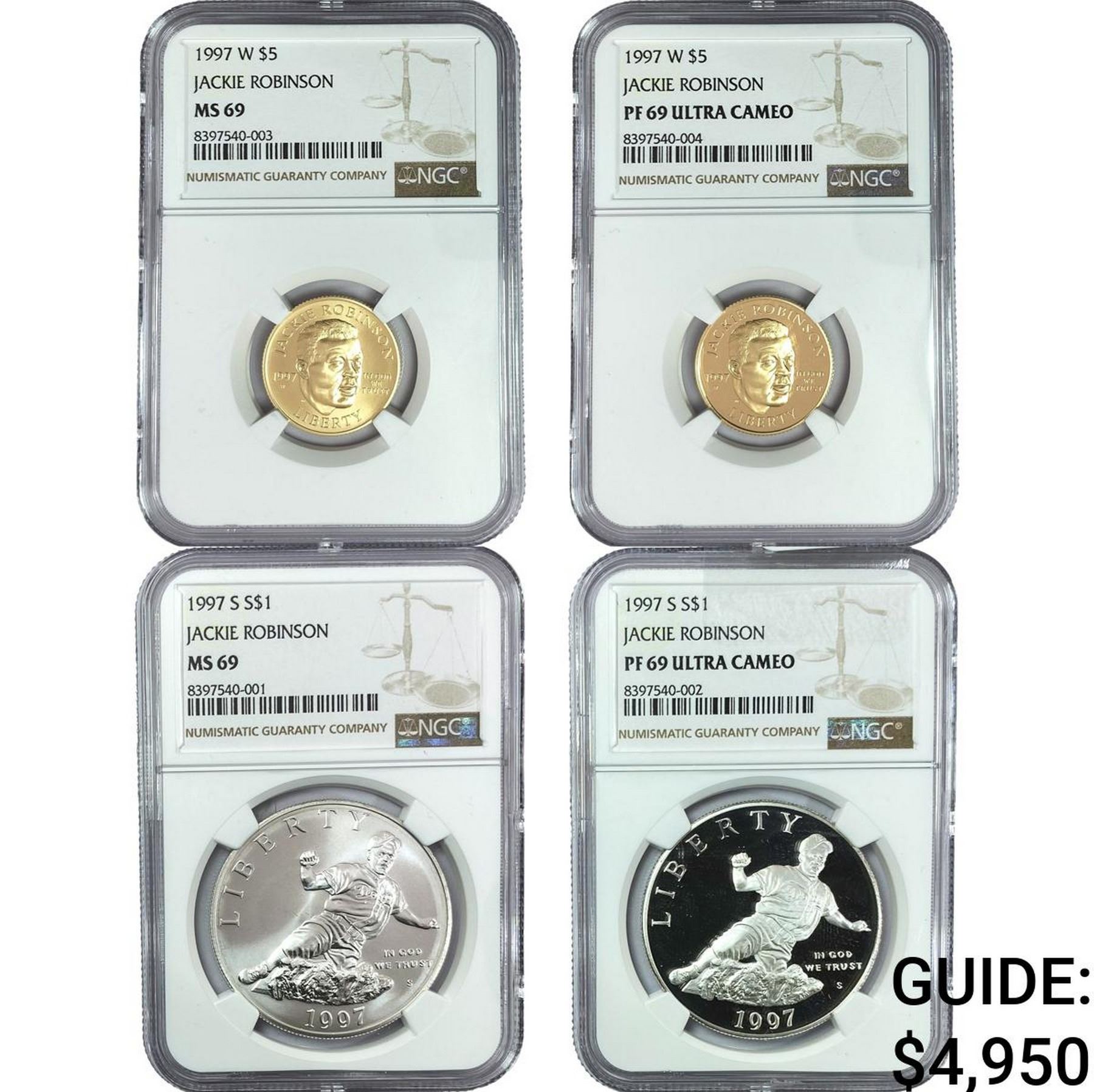 [4 Coins]1997 Jackie Robinson Silver Dollar&Gold$5 NGC PF/MS69 Ultra Cameo