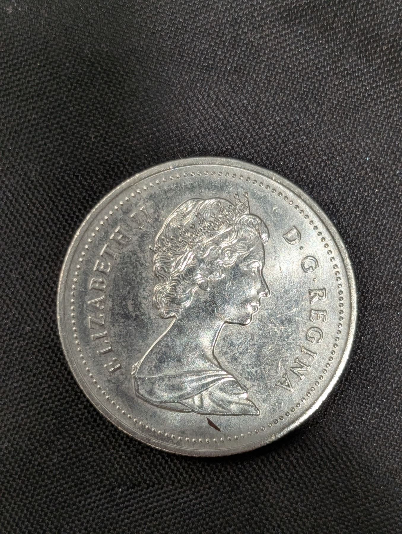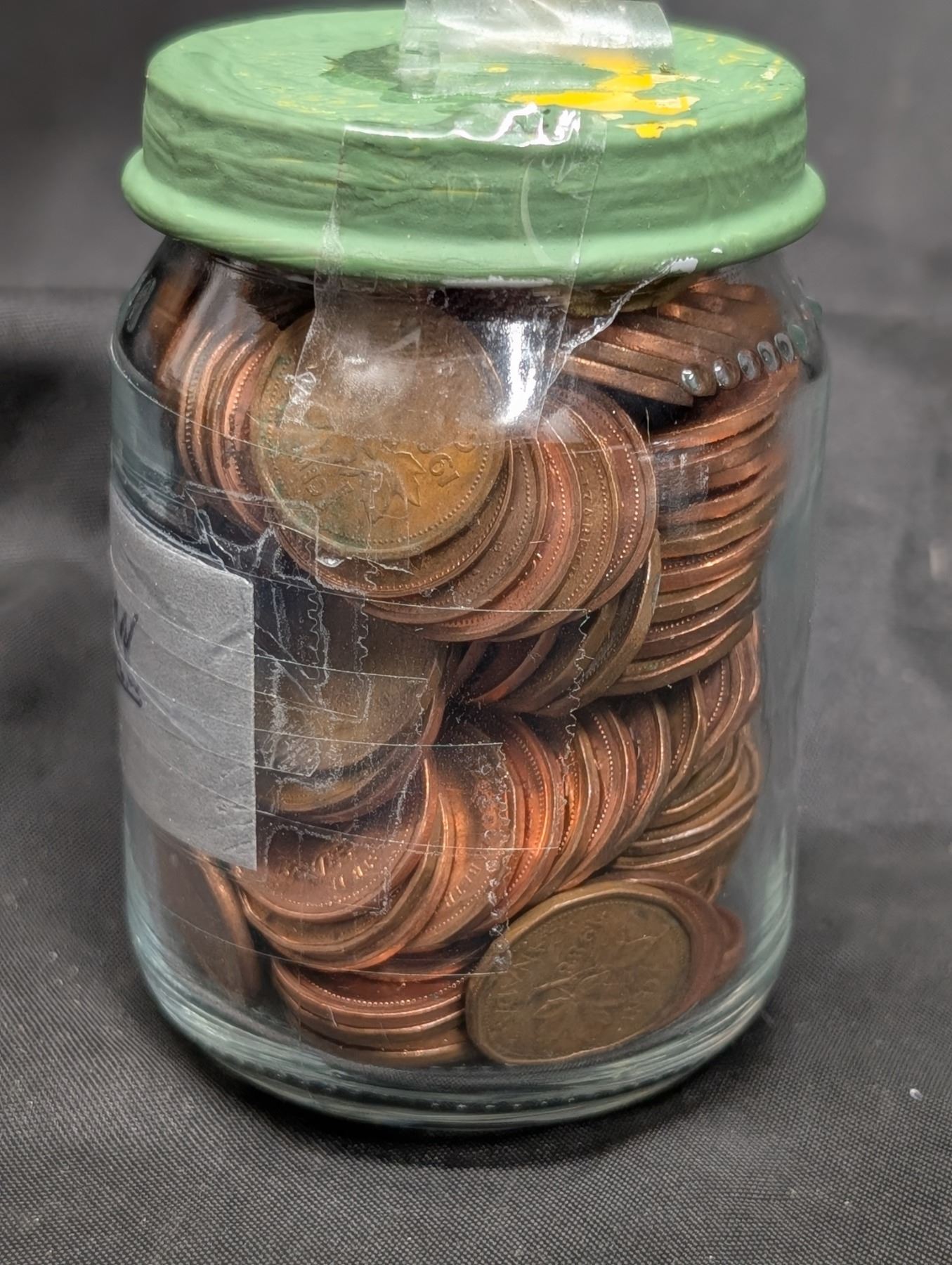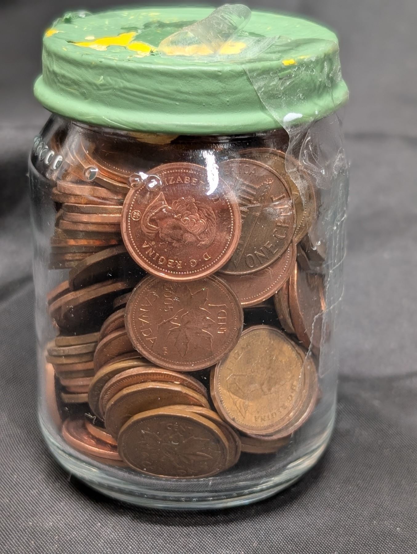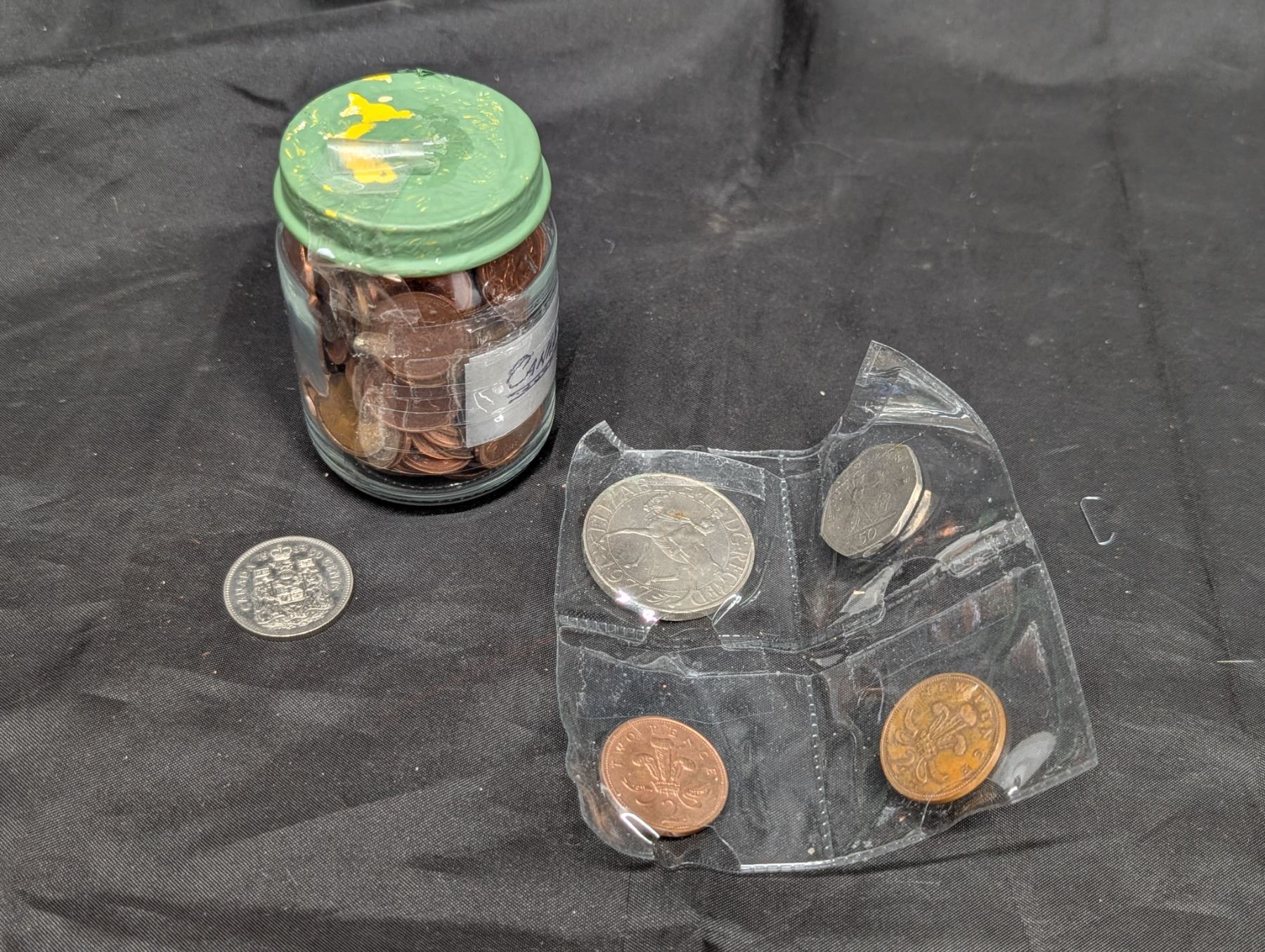 (4) Coins Around the world( Pence and Canadian and 1977 Queen Elizabeth II Silver Jubilee Crown Coin) W/ Jar full of Pennies