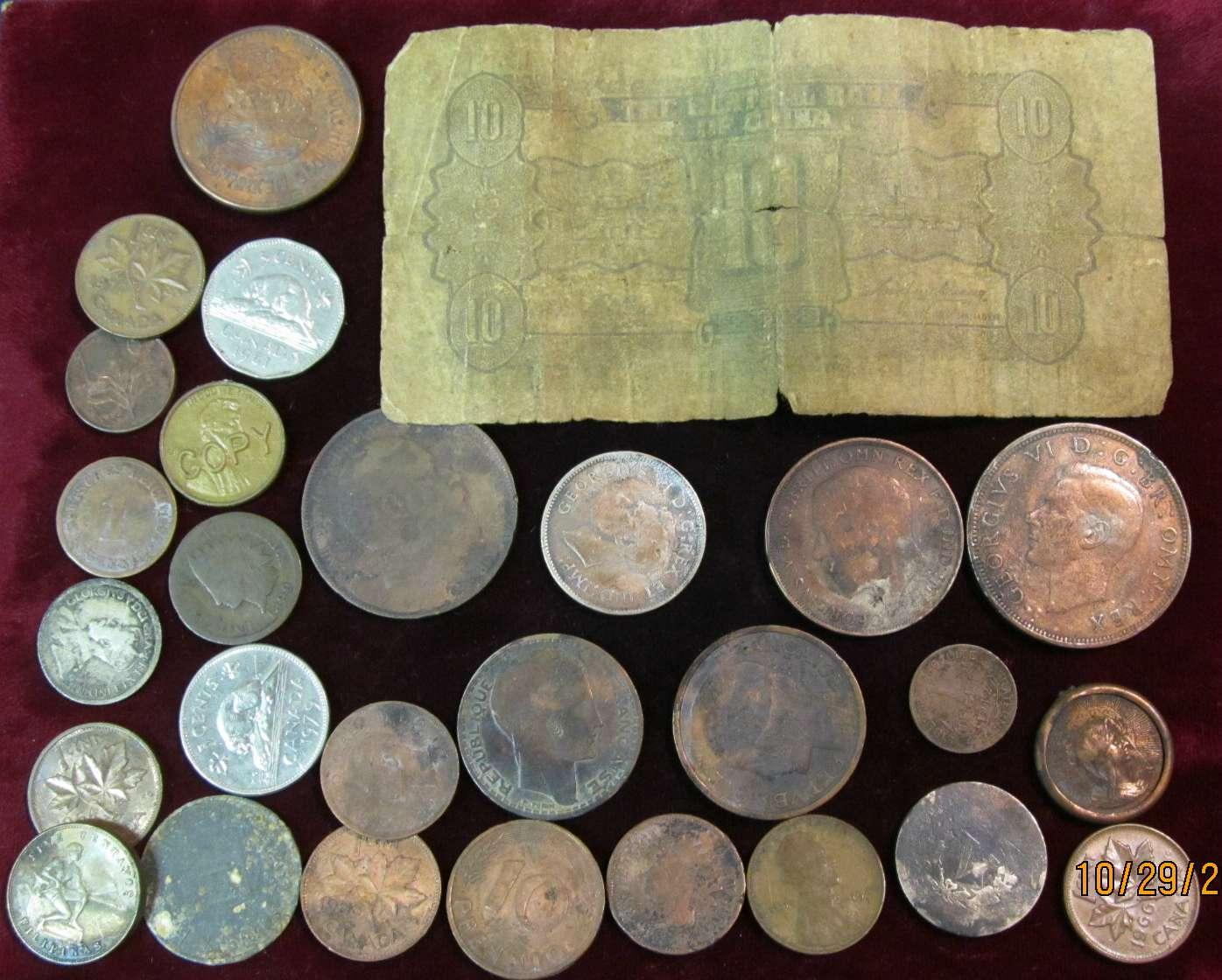 4. Collection of (28) Old U.S. & Foreign Coins, Paper Money & tokens. Includes some Silver, a couple of Indian Cents, and a Liberty Nickel.