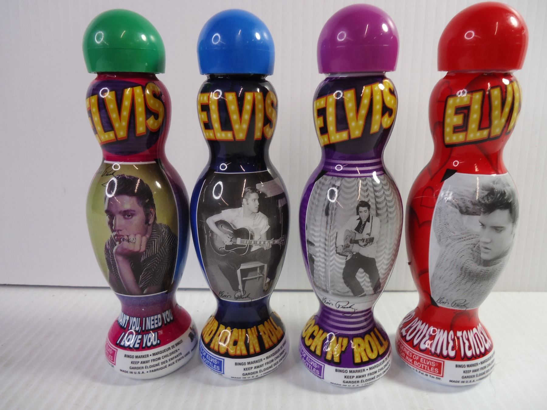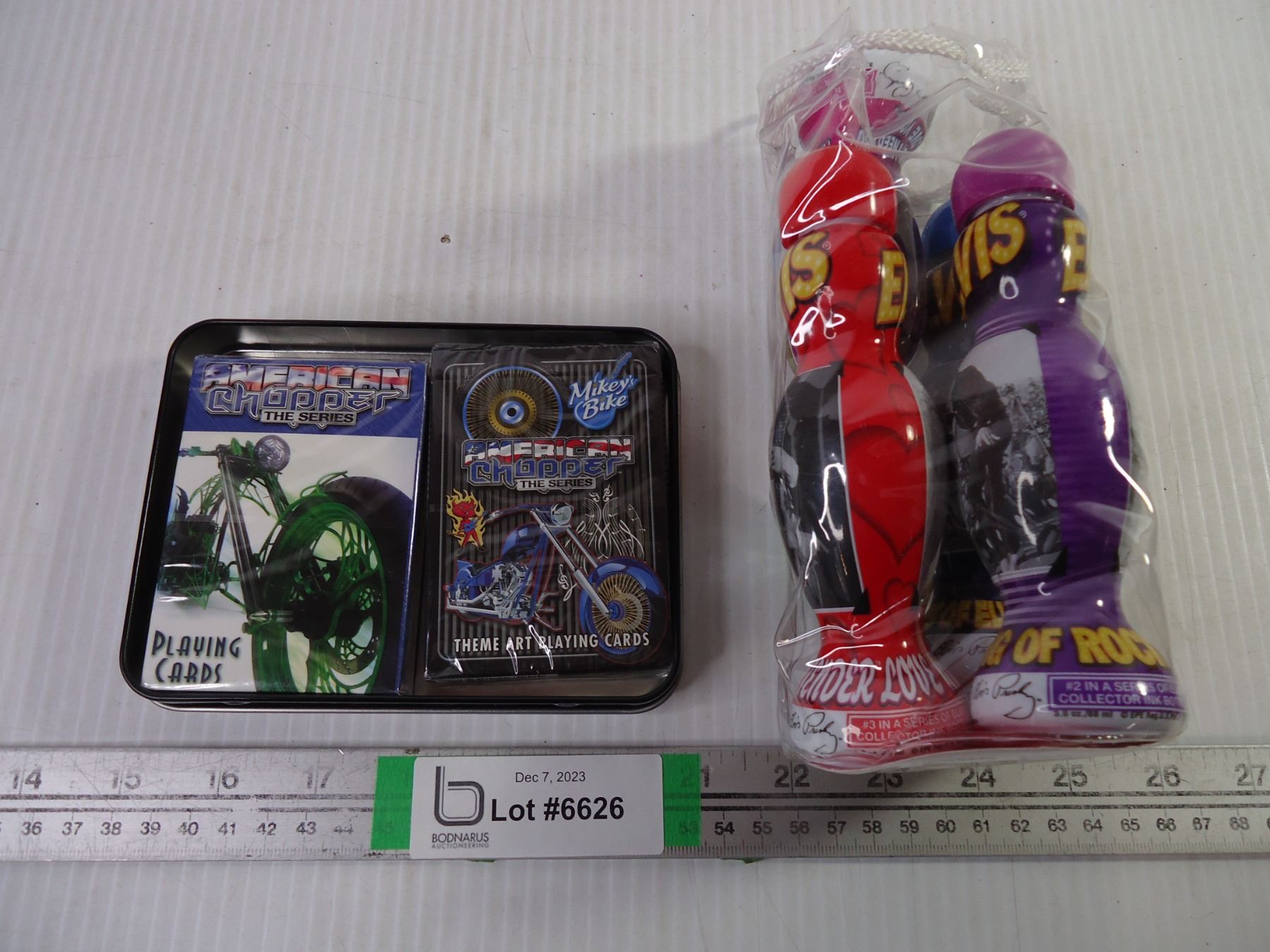 (4) Collector Elvis Ink Bottles and a Tin of (2) American Chopper Playing Cards