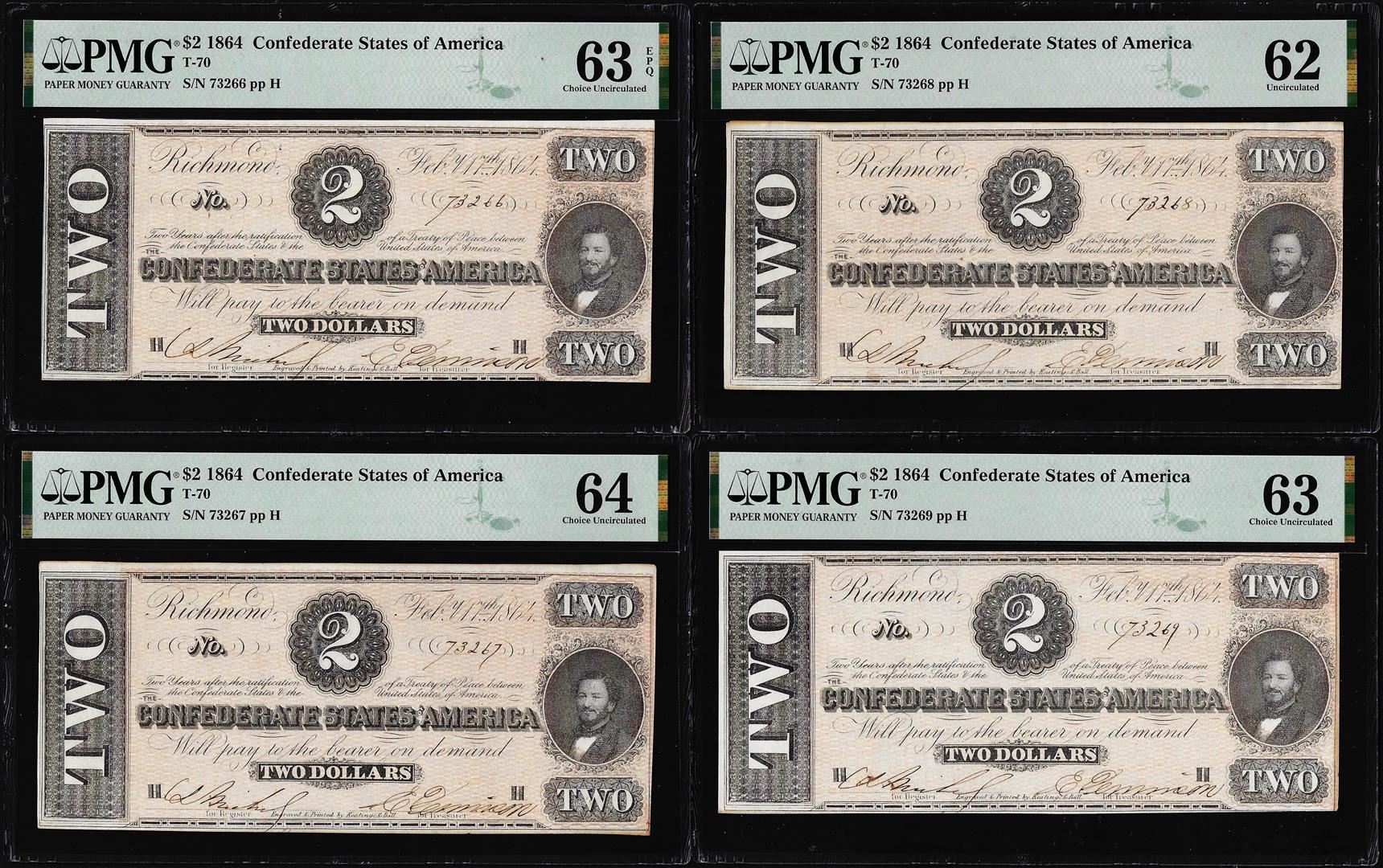 One (4) Consecutive 1864 $2 Confederate States of America Notes PMG Uncirculated 62/63/64. PMG Certified.