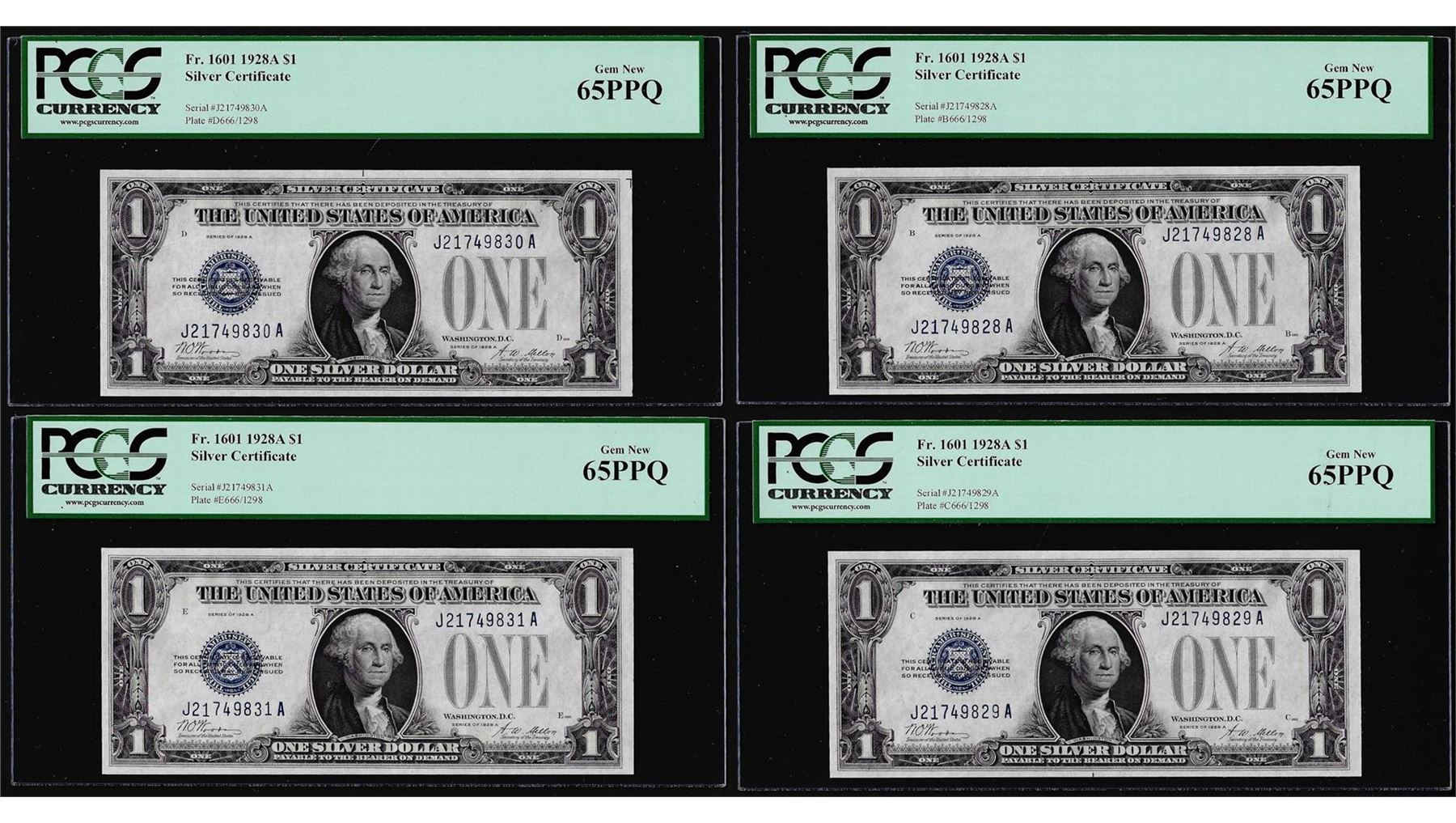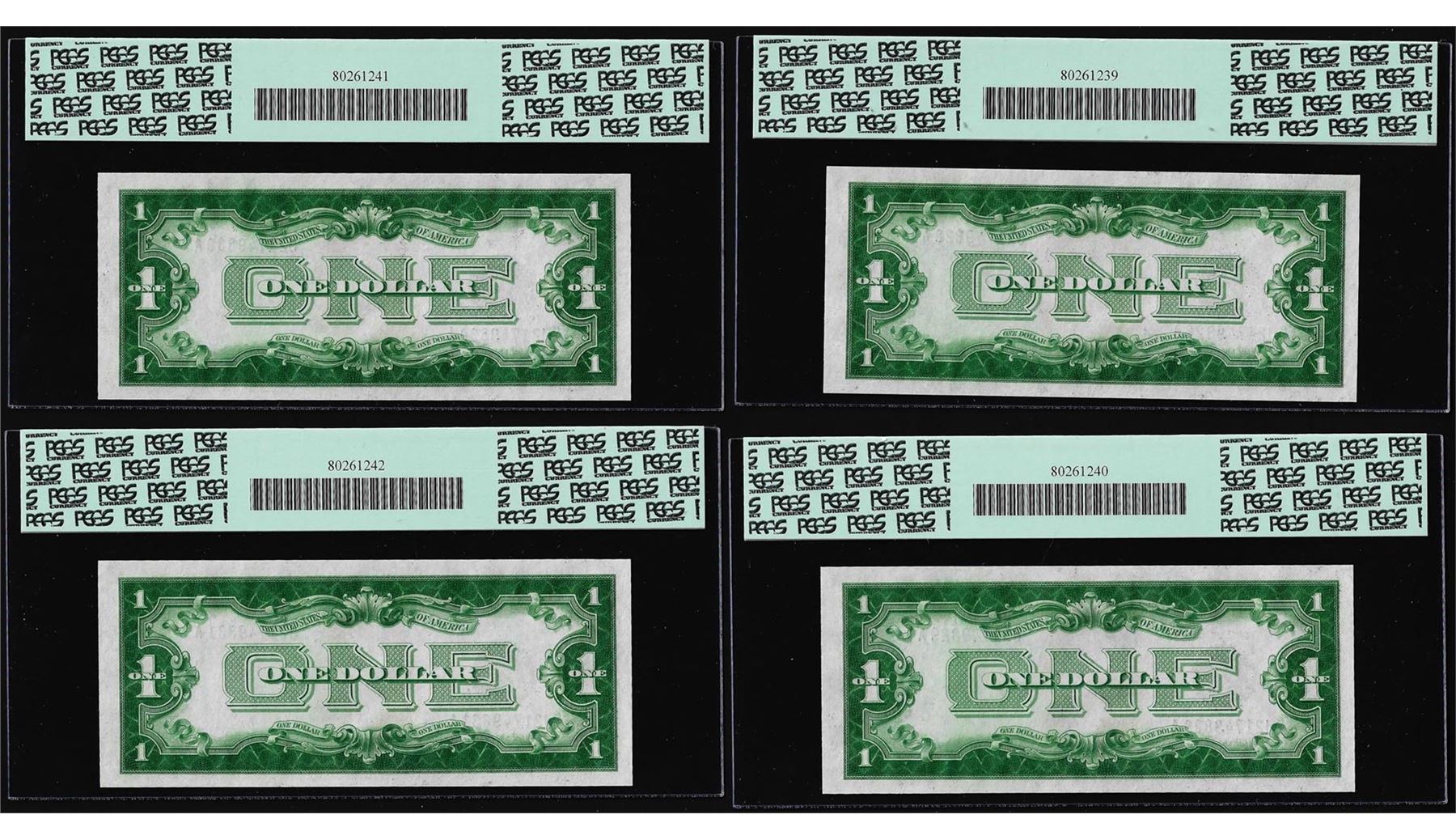 One (4) Consecutive 1928A $1 Funnyback Silver Certificate Notes PCGS Gem New 65PPQ. PCGS Graded.