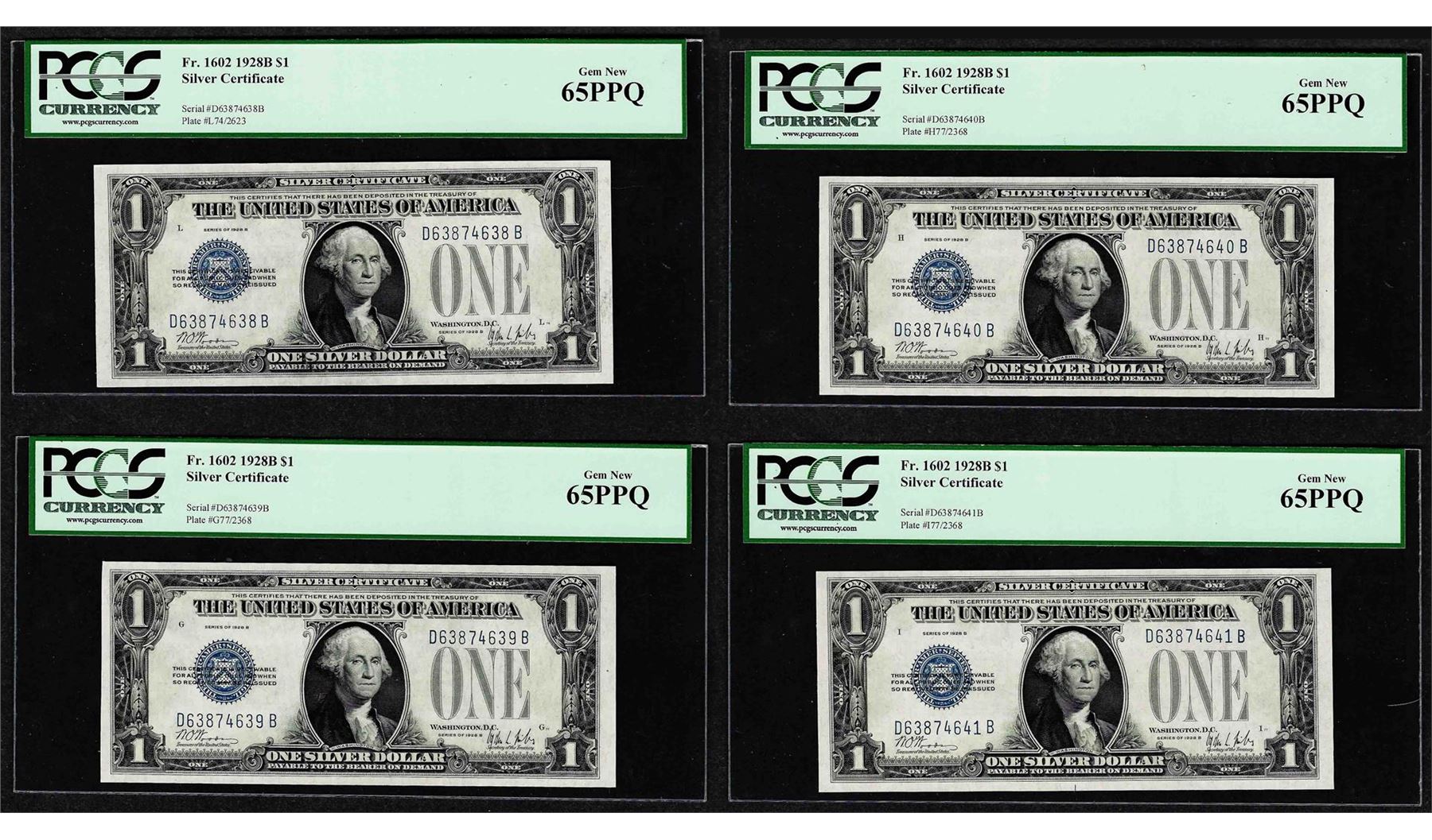 One (4) Consecutive 1928B $1 Funnyback Silver Certificate Notes Fr.1602 PCGS Gem New 65PPQ. PCGS Graded.