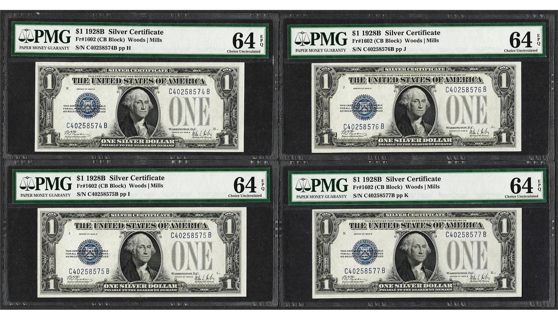 One (4) Consecutive 1928B $1 Funnyback Silver Certificate Notes PMG Choice Unc. 64EPQ. PMG Certified.