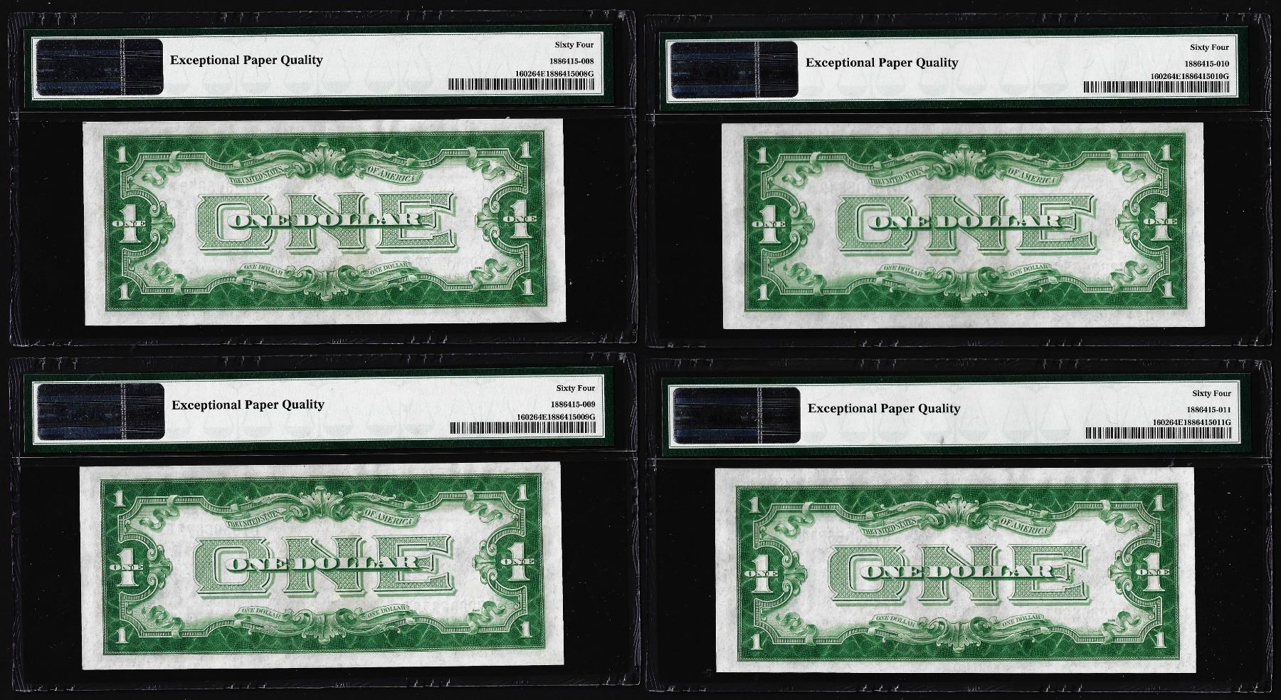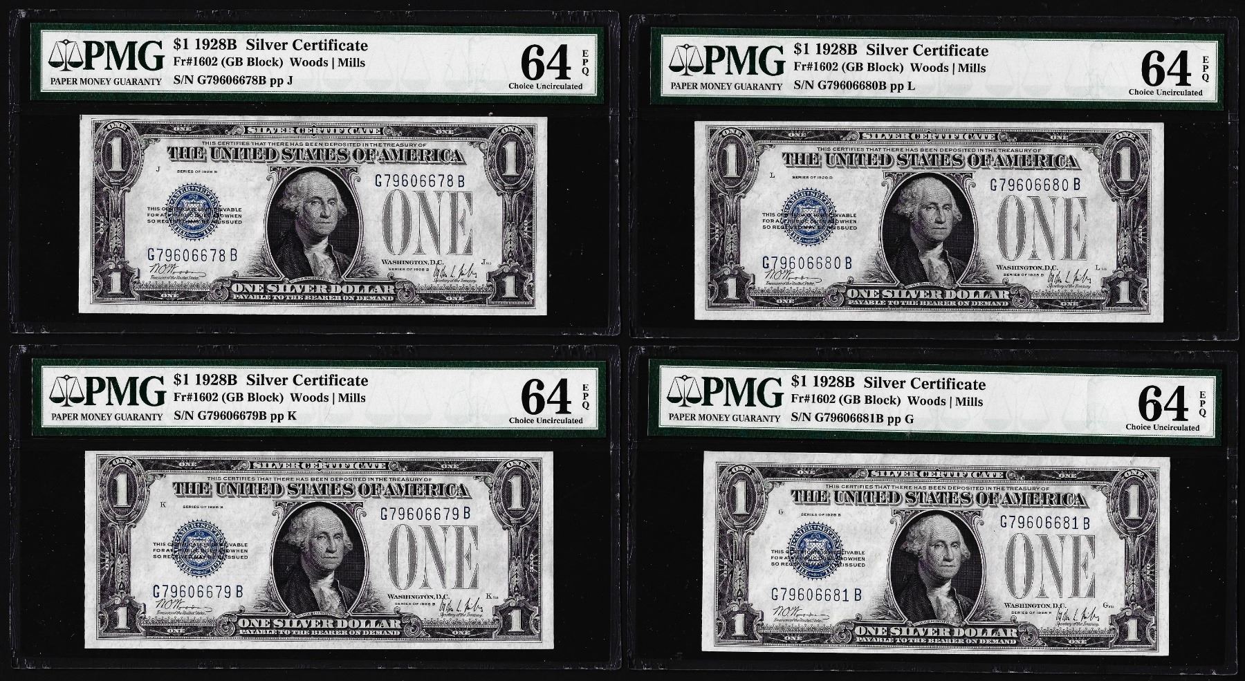One (4) Consecutive 1928B $1 Silver Certificate Notes Fr.1602 PMG Choice Uncirculated 64EPQ.