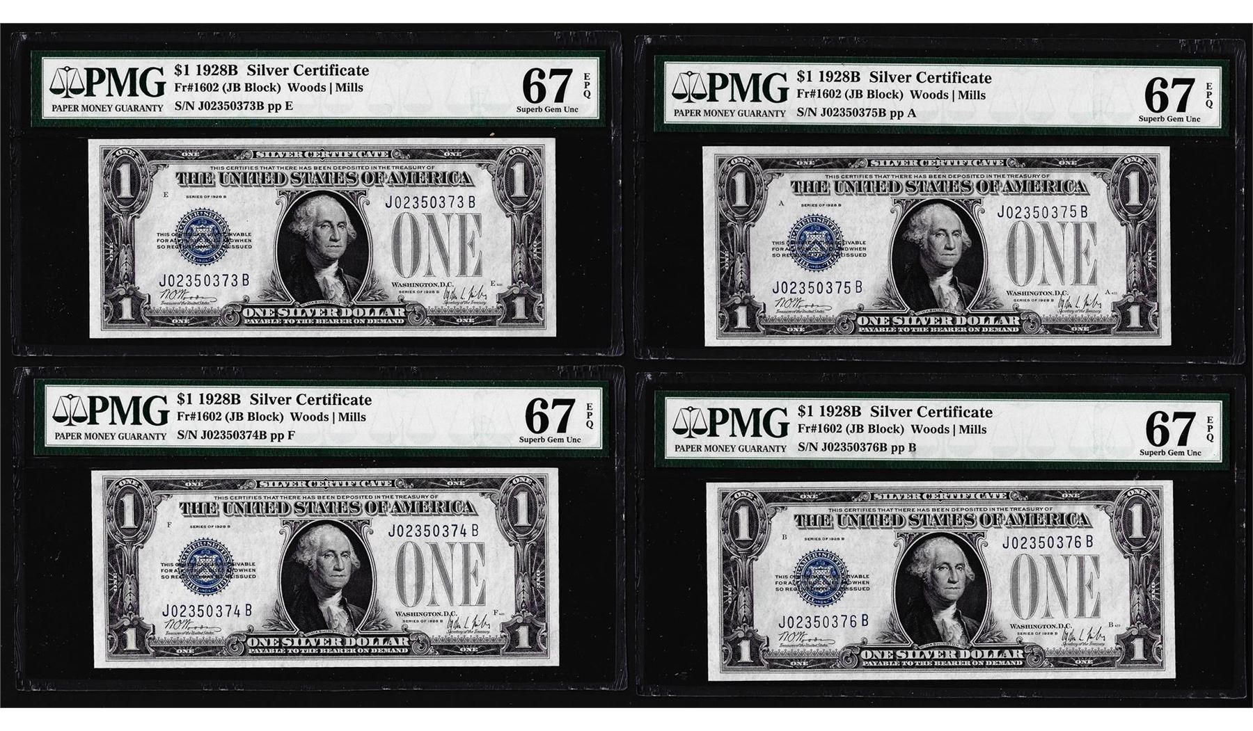 One (4) Consecutive 1928B $1 Silver Certificate Notes Fr.1602 PMG Superb Gem Unc. 67EPQ. PMG Certified.