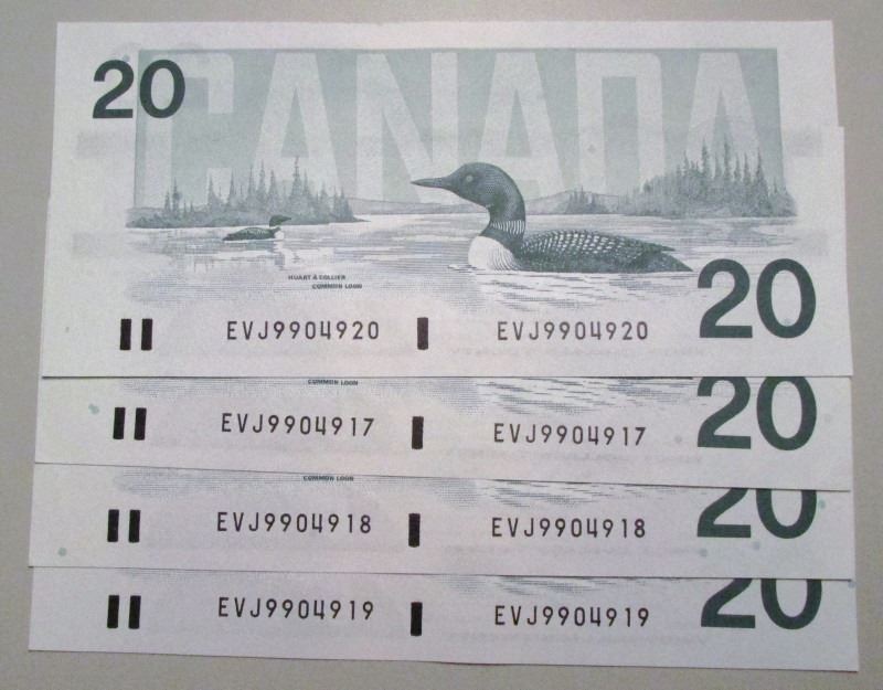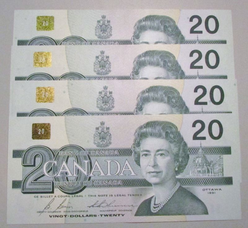 4 Consecutive 1991 Bank Of Canada $20 Bank Note - EVJ Series, With BPN - Trends Value $165