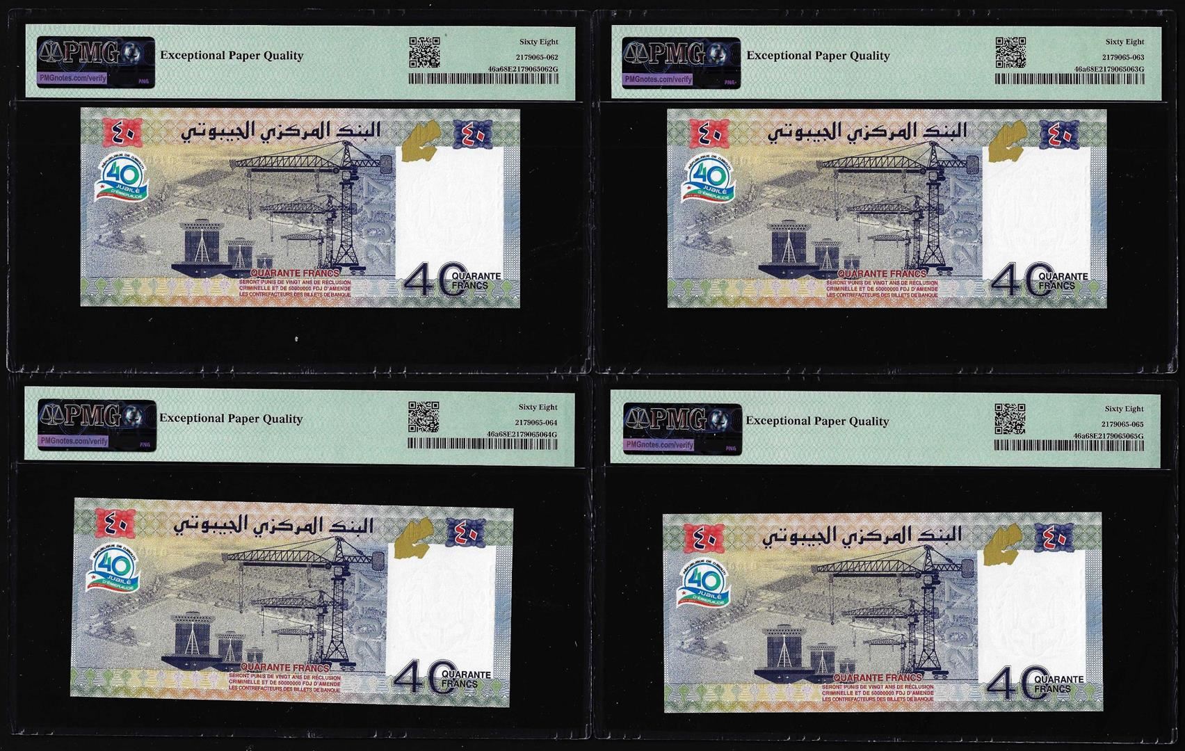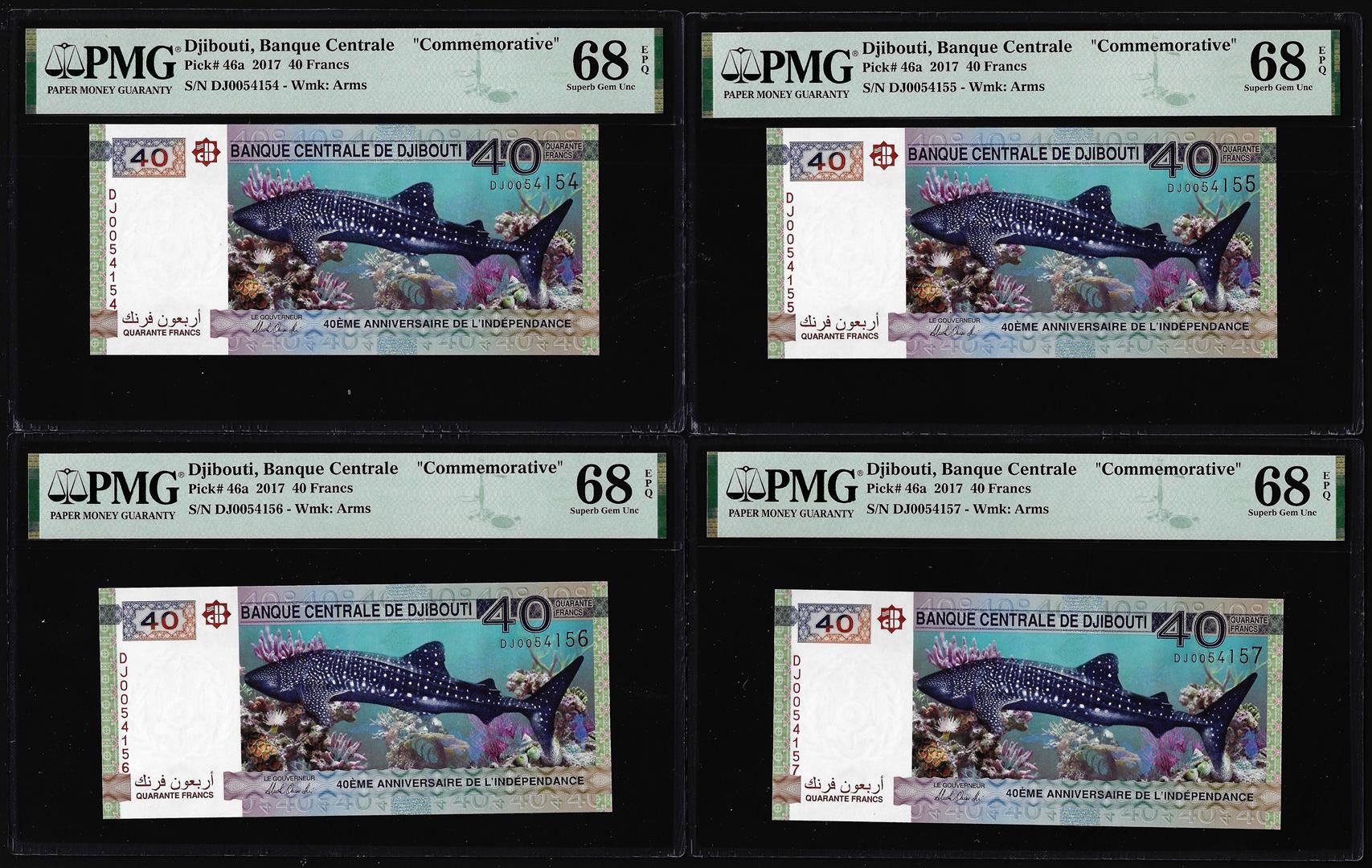 One (4) Consecutive 2017 Djibouti 40 Francs Bank Notes PMG Superb Gem Uncirculated 68EPQ. PMG Certified.
