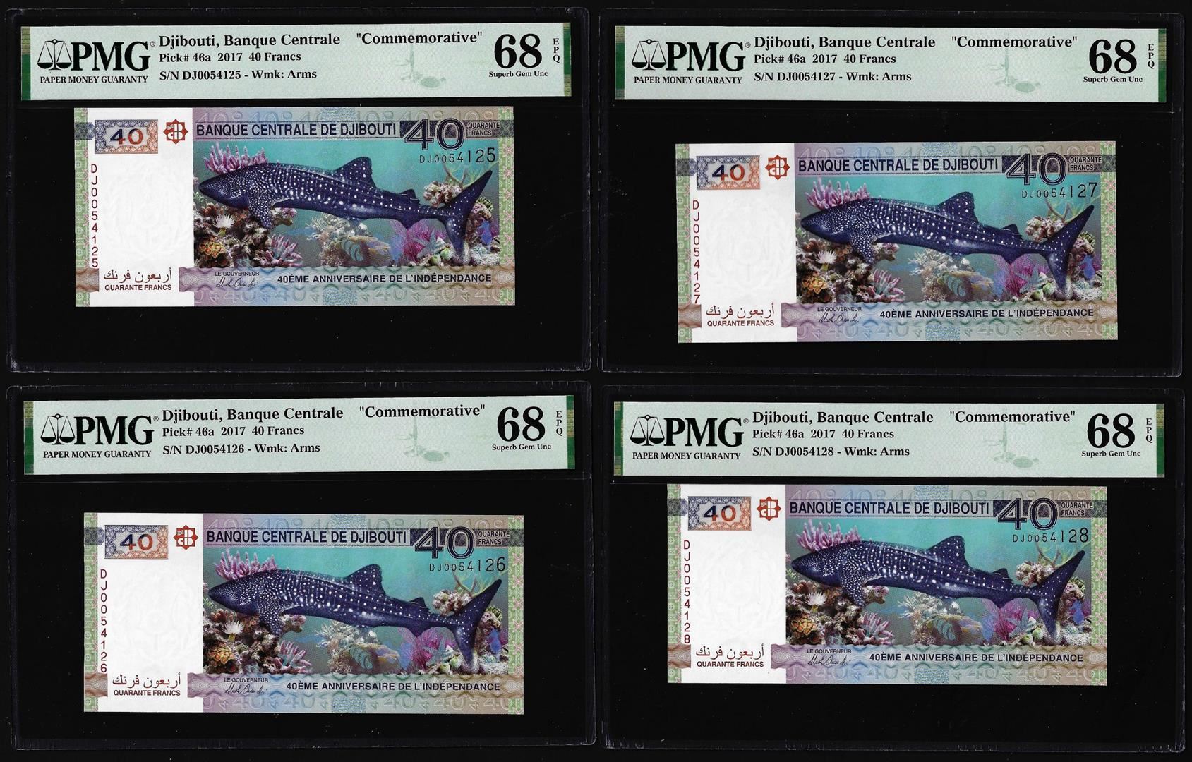 One (4) Consecutive 2017 Djibouti 40 Francs Bank Notes PMG Superb Gem Uncirculated 68EPQ. PMG Certified.